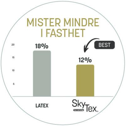 Resultatet viser at SkyTex® scorer bedre på både holdbarhet og funksjon over tid. Sammenlignet med Latex mister SkyTex® mindre i både fasthet, høyde og form etter langvarig bruk. Dette betyr at SkyTex® vil beholde samme egenskaper, følelse og komfort år etter år.