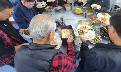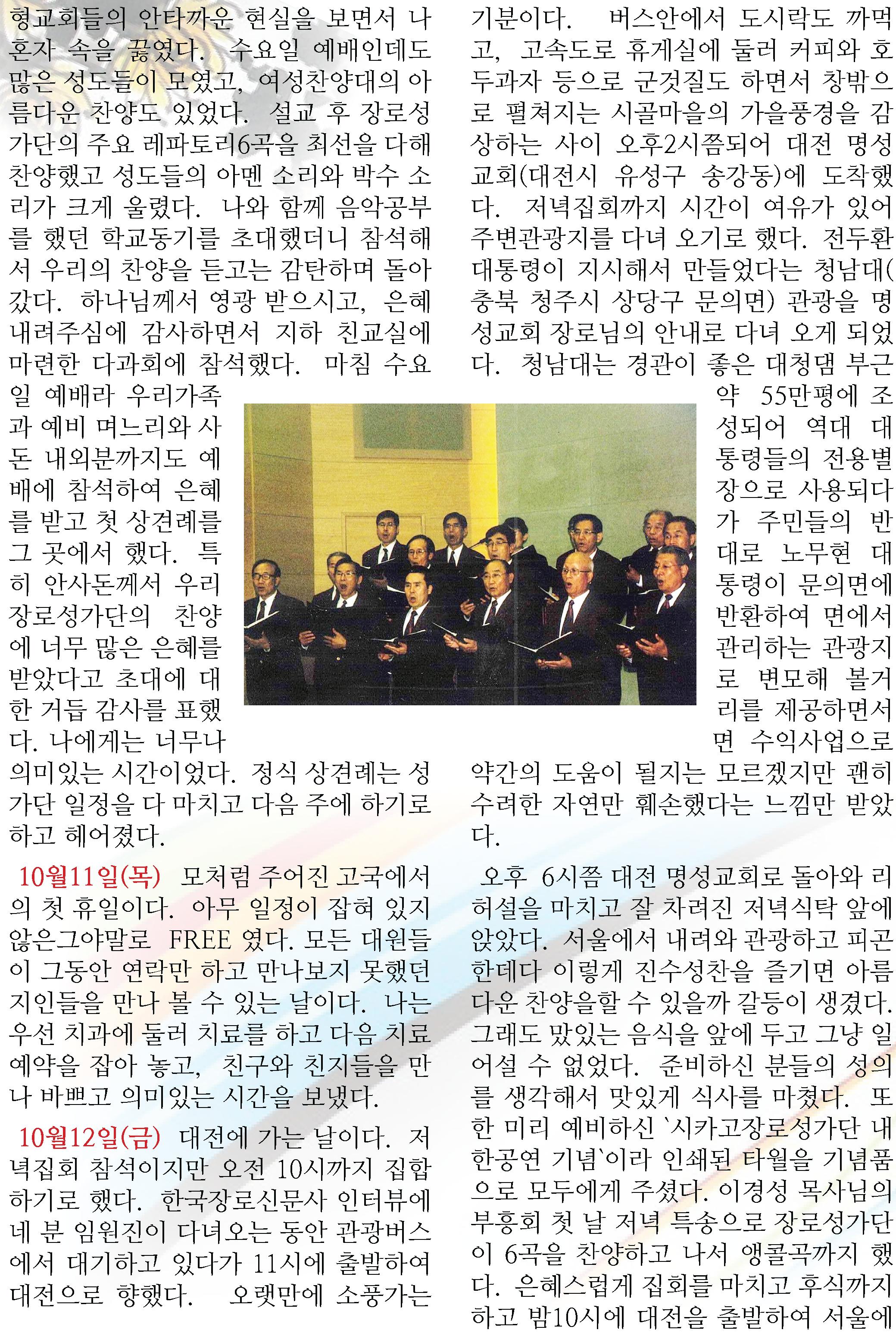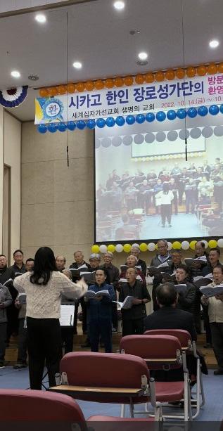 . 시카고장로성가단 지휘자의 조율과 절제된 찬양이 모든 성도들 가슴의 울림은 바벨로포로의 삶가운데 터져나온 시편처럼 이민자의 삶속에서 울려나온 찬양이 기 때문이었습니다. 예배 후 2층 식당에서 함께 공동체식사를 나누는 정겨운 모 습도 퍽 인상적이었습니다. 시카고장로성가단을 이끄시는 따뜻함이 있는 서정송