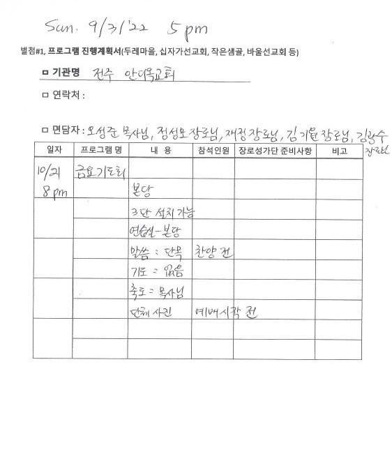 - 방배정시 고령자 배려(계단 등) - 단원끼리 친교/기도회