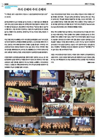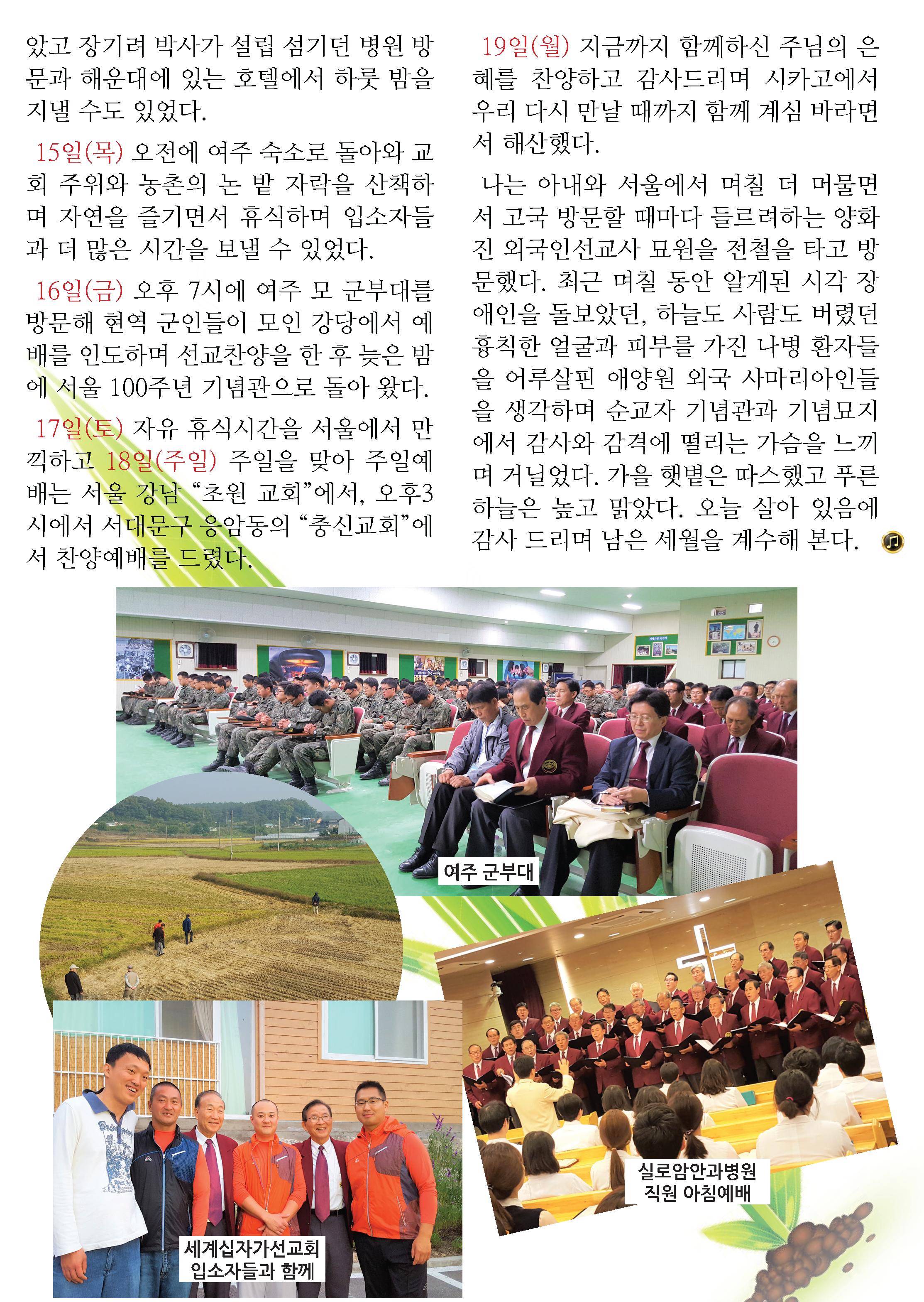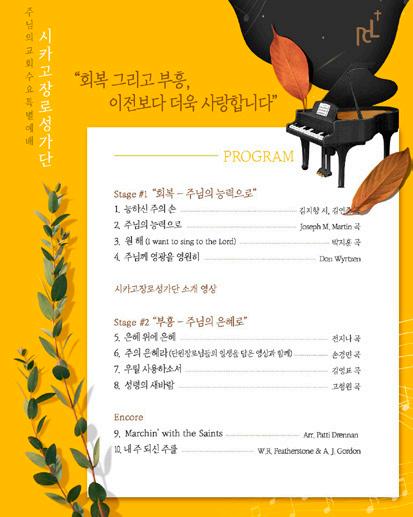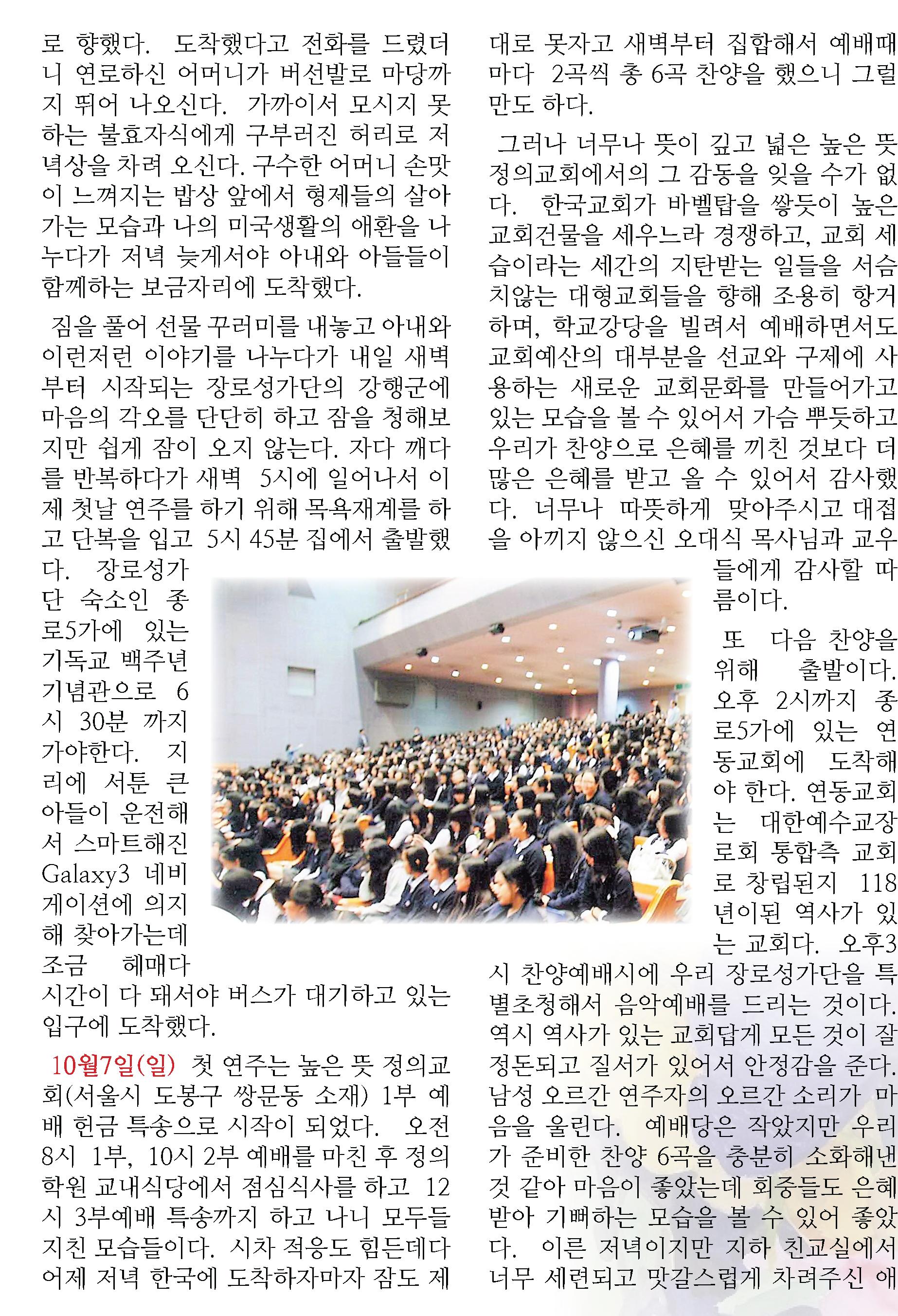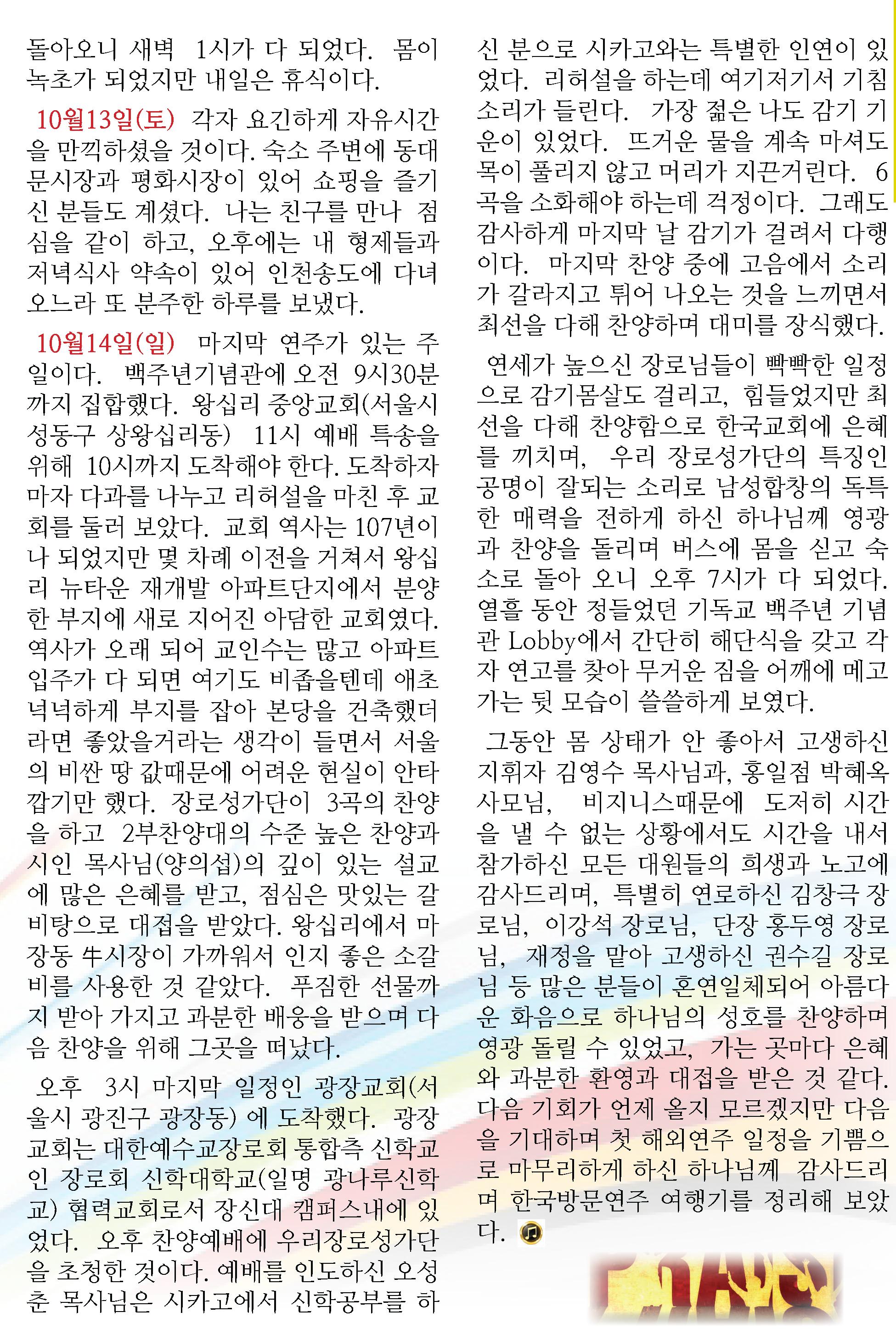 가을 깊어, 풍성한 결실을 추수하는 때, 1년 전에 약속했던 시카고장로성가단을 뵙게 되어 기뻤습니다. 평생의 삶을 돌아볼 때, 가장 아름답고 복 될 때가 언제일까 묻는다면 삼위일체 하나님을 찬양하는 찬양의 시간이라고 할 것입니다. 우리가 하나님의 은혜 가운데, 한평생을 살다가 우리의 생애가 끝나는 그 시간에 하나님을 찬양하다 하나님 앞에 갈 수만 있다면 그보다 더 복 된 인생이 또 있겠습니까?