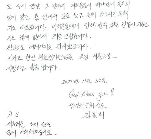 소망교도소 소장 권기훈입니다. 코로나 시국으로 모두가 힘든 여건 중에서도 저 희를 잊지 않고 4년 만에 다시 방문해 주신 시카고장로성가단 여러분께 먼저 감사 의 인사를 전합니다 그리스도의 사랑과 복음의 능력으로 사람을 살리고 갇힌자를 돌보겠다는 취지로 세워진 소망교도소가 금년 12월이면 어느덧 열두번째 생일을 맞습니다. 지난 2020년부터 시작된 코로나 시국으로 저희 소망교도소 역시 많은 어려움을 겪었습니 다 이 기간동안 소망교도소를 움직여 주셨던 거의 모든 외부 자원봉사자 의 참여가 전면 차단되고, 예배를 비롯한 각종 교육 프로그램 등 수용자의 내적 변 화에 필요한 수많은 과정들이 중단될 위기에 처하기도 했습니다. 하지만 이러한 어려움 속에서도 매 순간 우리를 이끄시는 하나님의 손길을, 마치 광야 속 이스라엘 백성들에게 하나님께서 주셨던 만나와 메추라기처럼, 우리 역시 경험할 수 있었던 은혜로운 기간이기도 했습니다 특히, 이번에 소망교도소를 다시 찾아 주신 시카고장로성가단의 섬김과 헌신을 통 해, 하나님의 은혜와 손길을 다시 한번 구체적으로 경험할 수 있었습니다. 일평생 을 주님만 의지하면서 노구를 이끌고 이곳까지 방문해 주신, 그래서 이곳 수용자 형제들과 함께 하나님을 찬양하시던 시카고장로성가단의 장로님 한분 한분이 곧 복의 근원이요, 복의 통로임을 보았던 것입니다 비록 육체는 쇠잔할지라도 오히려 더욱 밝게 빛나는 아름다운 영혼으로 소외된 곳 을 섬기며, 주님의 마음으로 갇힌자를 돌보시던 여러분의 모습 속에서, 저와 소망 교도소의 모든 형제들은 우리가 왜 사는지, 우리가 무엇 때문에 살아야 할지, 그리 고 생명을 살리는 진리가 무엇인지를 다시 한번 되돌아 보는 계기가 되었습니다 깊어가는 가을에, 아름답고 멋진 영혼의 찬양으로 섬겨 주신 시카고장로성가단을 소망교도소로 보내 주신 하나님께 감사드릴 뿐입니다. 저는 여러분의 섬김과 헌신 을 결코 잊지 못할 것입니다. 항상 하나님의 은혜가 시카고장로성가단과 장로님들 가족 한분 한분 가운데 늘 함 께 하시길 기도하겠습니다. 그리고 그 은혜 가운데 우리가 다시 만날 그 날이 속히 오리라 믿습니다. 감사합 니다