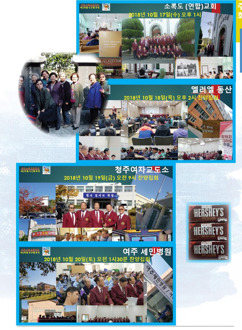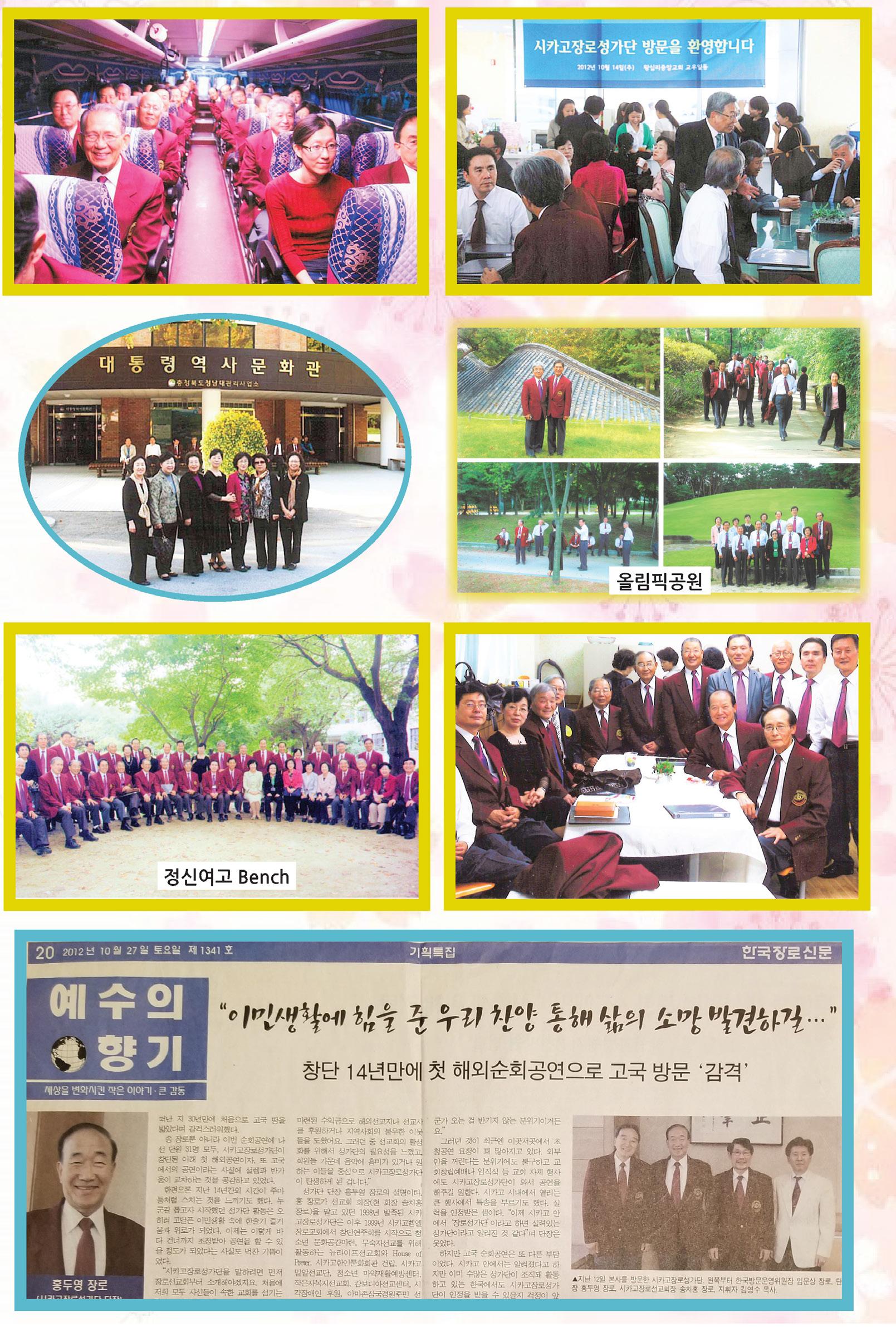 특별히 우리의 형제인 시카고장로성가단과 함께 한 찬양하는 순례자 찬양을 부르게 하시고 육해공 본부교회 MCF 마하니임 합창단과 함께 우정의노래는 감동이였고 행복이였습니다. 또한 익산장로합창단. 시카고장로성가단. MCF 마하니임 합창단과 우리 가운데 찬양과 율동은 천사장이 흠모하는 찬양이라고 봅니다. 얼마전만 하더라도 익산장로합창단 장로님께서도 평균 연령이 75세가 넘는 연령이였는데, 시카고장로성가단의 평균 연령 75세이라고 하여 깜작 놀라기도 하였답니다 제4차 고국 순회공연이 10박11일동안 잠시라도 쉴새없이 강행군 하시면서 오직 하나님께 영광을 올려드린다는 열정 하나로 혼신과 섬김을 다하신 단장 서정송