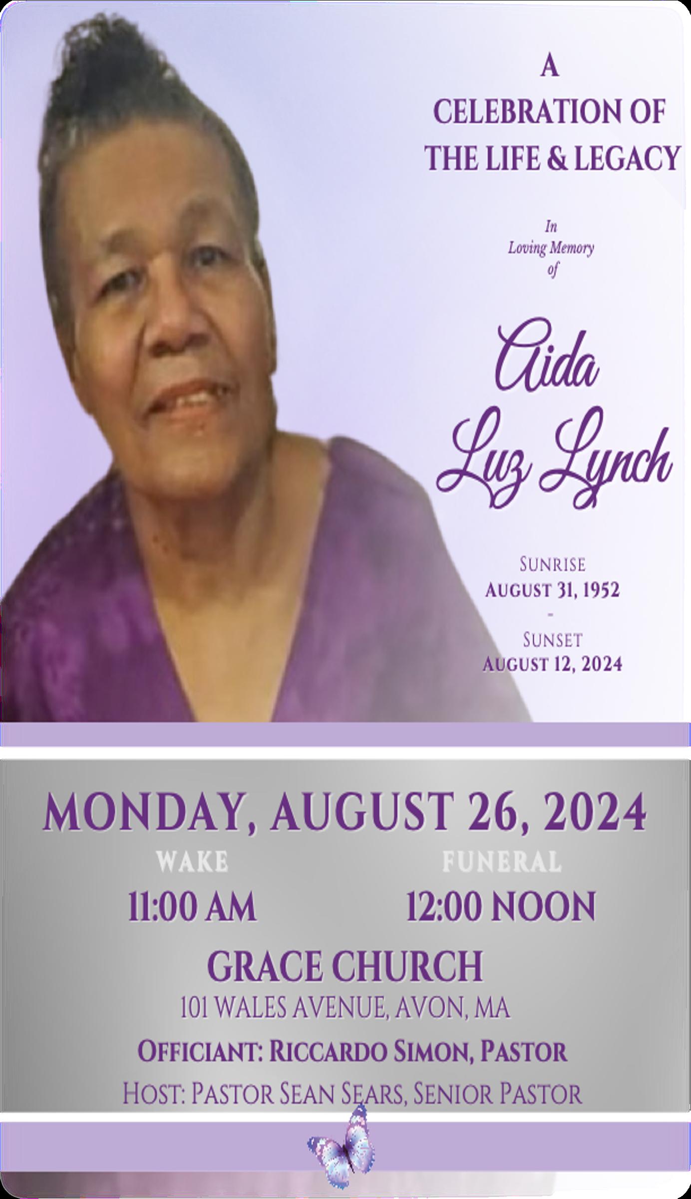 Aida is survived by her husband, Dennis Lynch; daughter, Iraida (Iris) Carreras; son, Dennis Pizarro; daughter-in-law, Lynette Pizarro; grandchildren, Alexander Williams Jr.; Sha’Miah Williams; Tai’Jah Williams; Kyla Williams; Dennis Lorenzo Pizarro; Ashton Williams; and great-grandchildren, Alyana Williams; Artist Garrett; Aliza Wilder; Amor Garrett; Aya Williams; and a brother, sisters, nieces, and nephews.