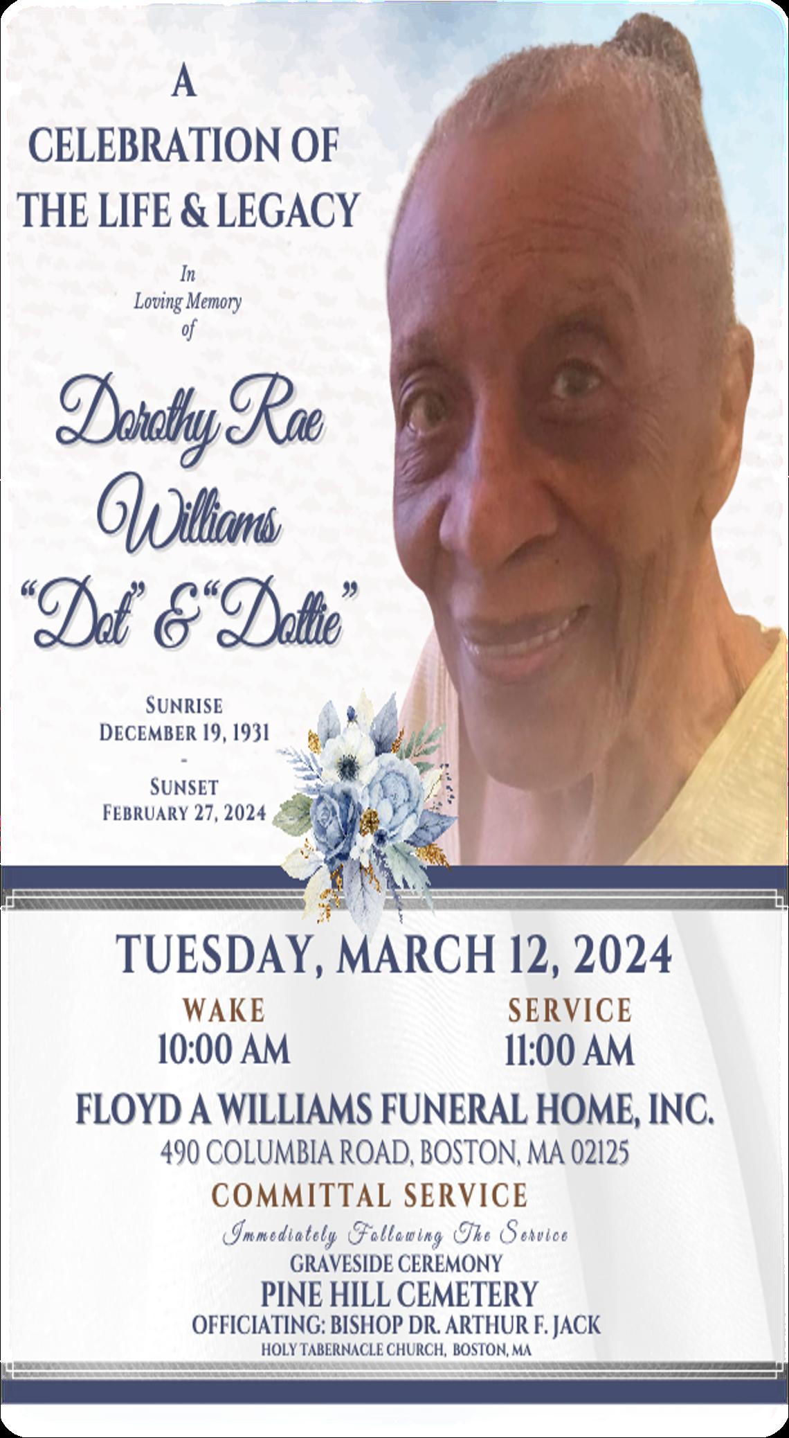 Dorothy Rae Williams, known to many as Dot or Dottie, passed away on Tuesday, February 27, 2024, at the age of 92. She was a beloved resident of Quincy, MA, but was originally from Elba, Alabama, born on December 19, 1931, to Rayfield and Jessie Mae Reynolds.