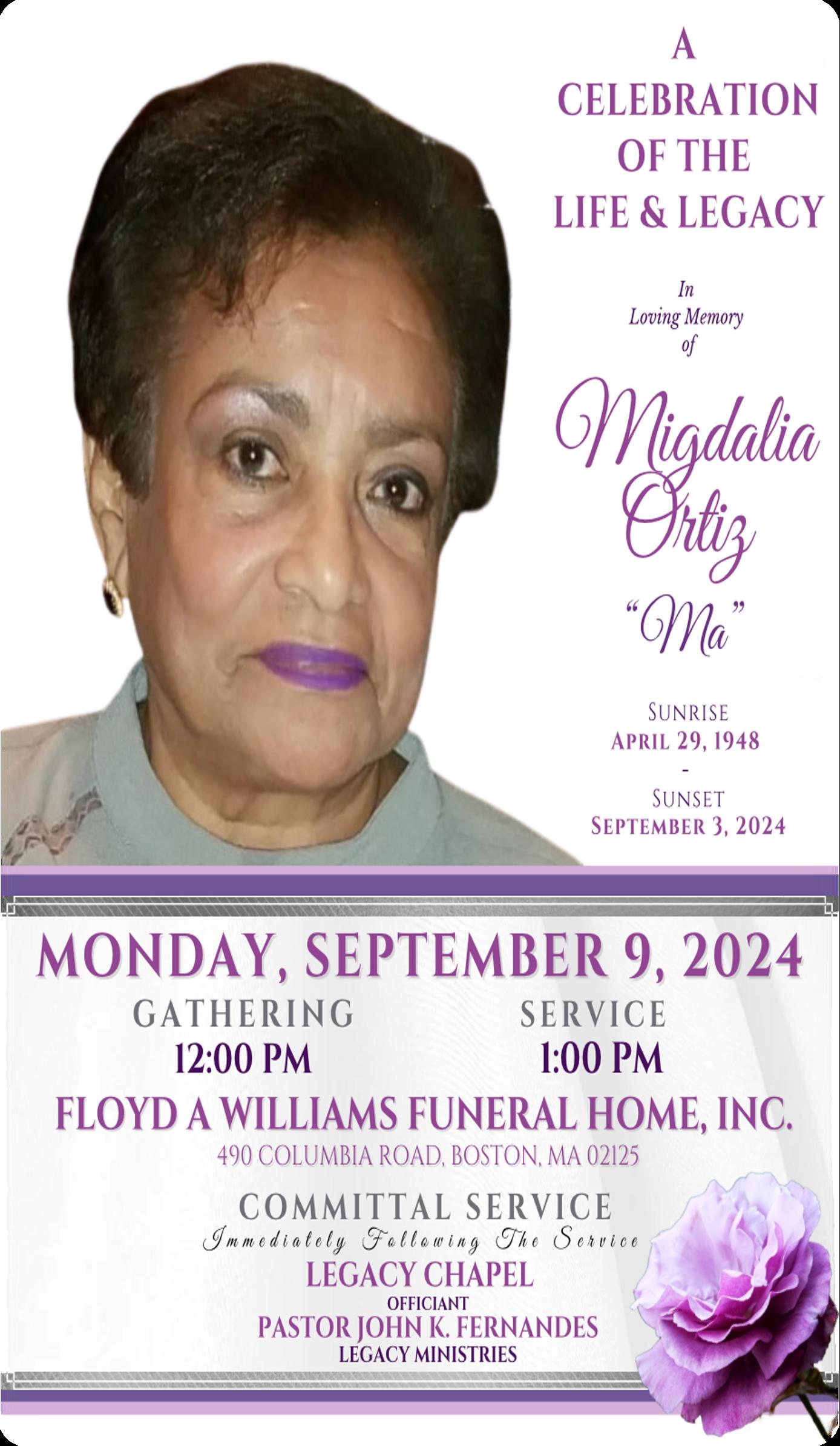 It is with deep sorrow yet profound gratitude for a life well lived that we announce the passing of Migdalia Ortiz. Surrounded by the love of her family, Migdalia departed this world peacefully on Tuesday, September 3, 2024, at the age of 76.