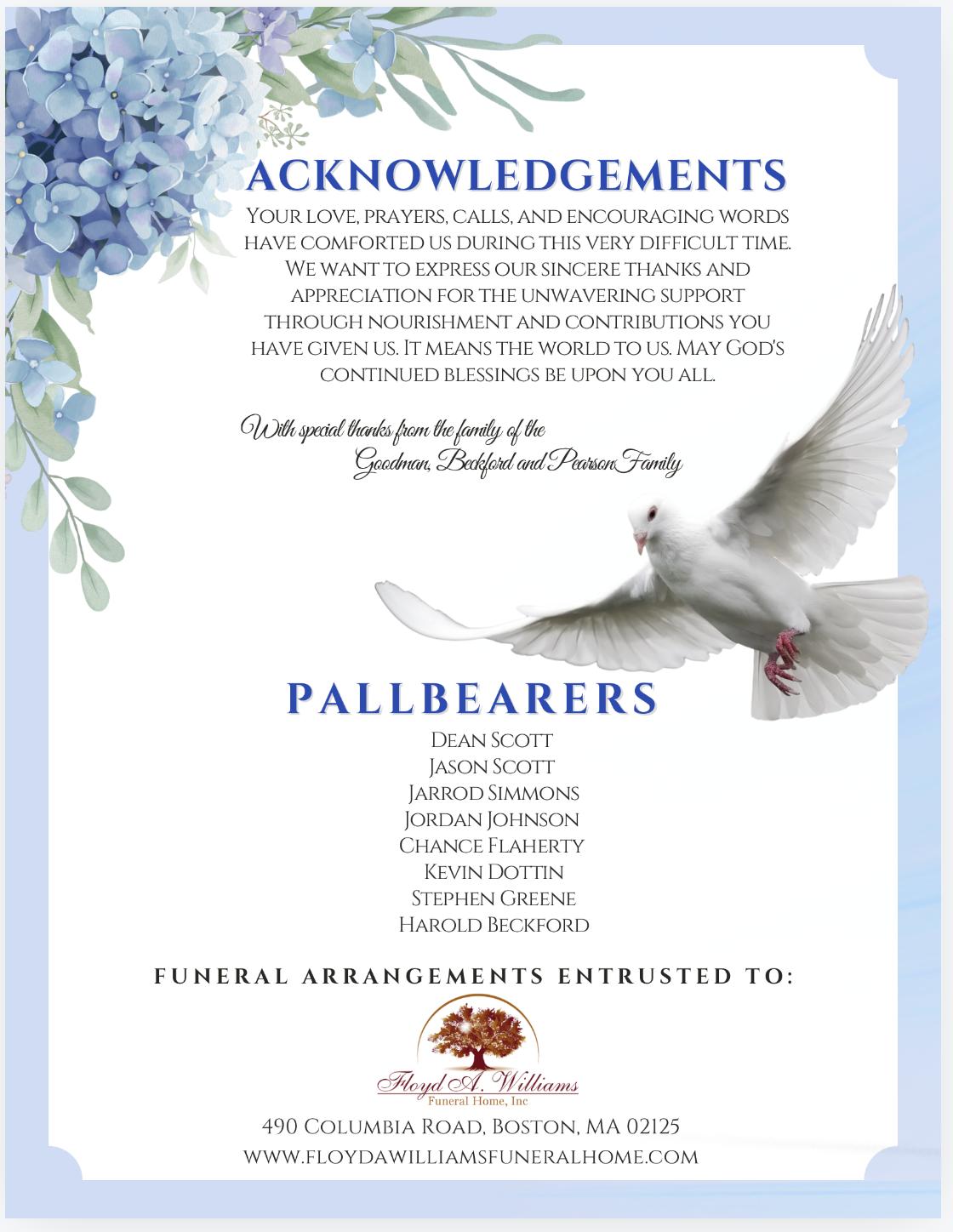 She leaves to cherish her memory her children Phyllis Beckford, Darlene (James) Pearson, Derek Goodman; her sister Anita (Greene) Beckett; grandchildren Shelley (Ehren) Flaherty, Divon Goodman, Jayda Pearson, India Goodman; great-grandchildren Deavoni Beckford, Demetri, Chance and Amari Flaherty, Layla Goodman, Xavier and Alaia Craig and great-great grandchild Kayden Gordon; nieces and nephew Terri (Lodis) Johnson, Dean (Kim) Scott and Rhonda Greene, her dear friend Grayce Stead and a host of other family and friends.