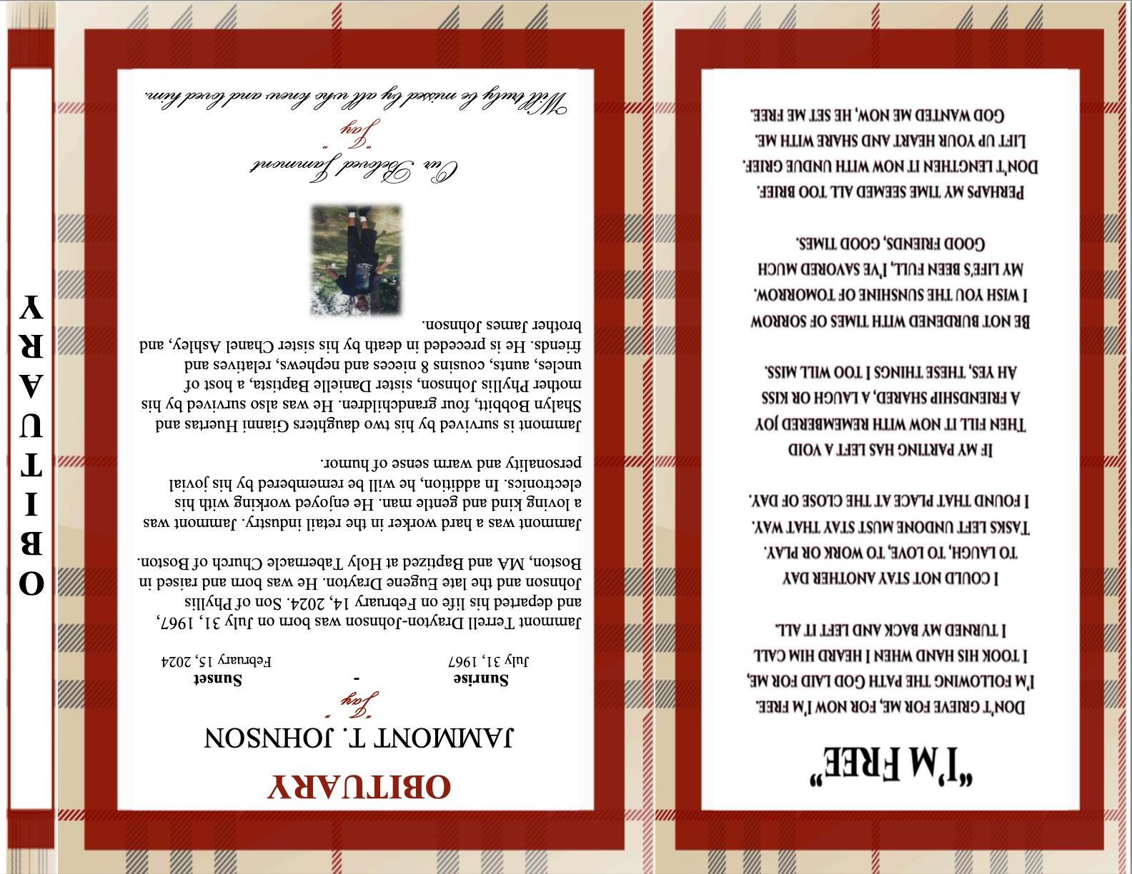 S u n r i s e S u n r i s e J u l y 3 1 , 1 9 6 7 J u l y 3 1 , 1 9 6 7 -S u n s e t S u n s e t F e b r u a r y 1 4 F e b r u a r y 1 4 , 2 0 2 4 , 2 0 2 4 JJammont ammont Terrell Terrell Drayton Drayton JJohnson ohnson A A CELEBRATION OF CELEBRATION OF THE LIFE & LEGACY THE LIFE & LEGACY of of T U E S D A Y , M A R C H 1 2 , T U E S D A Y , M A R C H 1 2 , 2 0 2 4 2 0 2 4 W A K E W A K E S E R V I C E S E R V I C E 2:00 PM 2:00 PM 3:00 PM 3:00 PM FLOYD A WILLIAMS FUNERAL HOME, INC. FLOYD A WILLIAMS FUNERAL HOME, INC. 490 COLUMBIA ROAD, BOSTON, MA 02125 490 COLUMBIA ROAD, BOSTON, MA 02125 I m m e d i a t e l y F o l l o w i n g T h e S e r v i c e I m m e d i a t e l y F o l l o w i n g T h e S e r v i c e CHAPEL CHAPEL CEREMONY CEREMONY LEGACY CHAPEL LEGACY CHAPEL C O M M I T T A L S E R V I C E C O M M I T T A L S E R V I C E “Jay”
