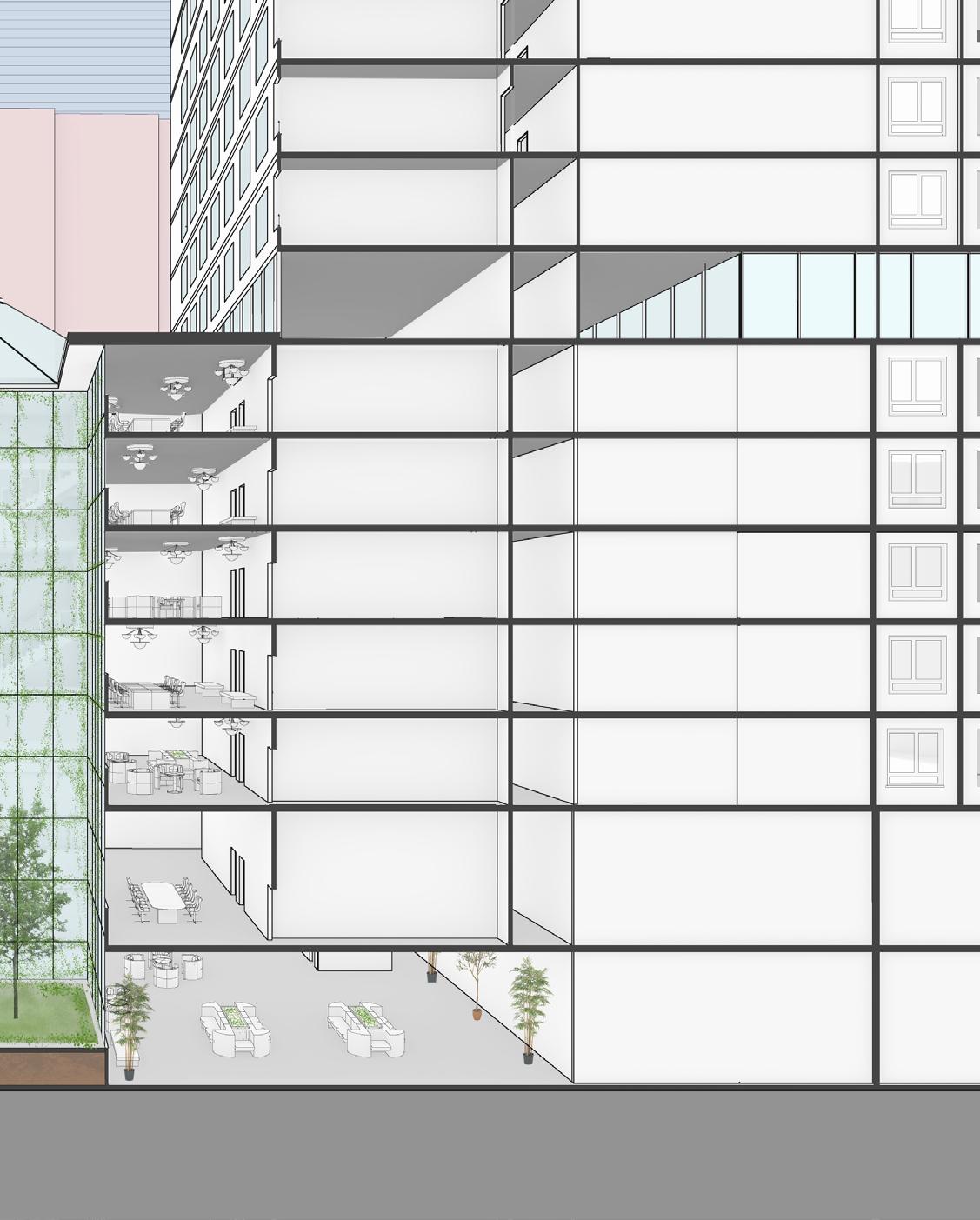 ventilation through the incorporation of a skylight. This reduces reliance on mechanical systems in the deep fosters a sense of openness and connectivity across different levels of the building. appropriated to host informal events such as pop-up stores and flea markets.
