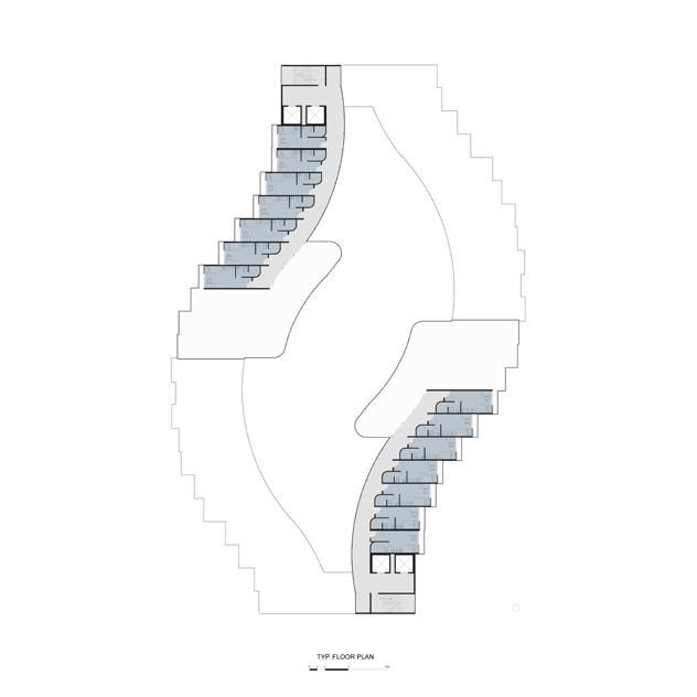 Spatial Organisation: The ground floor plan has a double-height layout, lined with retail stores and communal spaces. It aims to act as a link to the active urban environment outside the main entrance. The other floor plans on the right showcase the relationship between the residential and rich social program.
