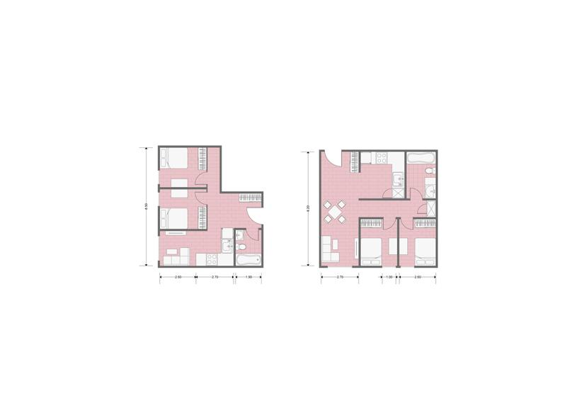 Unit Mix & Configuration: Prefabricated modular units offer natural light, ventilation, privacy, and modern interiors with ample storage, fostering interaction and meeting the needs of young adults. The chart on the left highlights unit distribution, dominated by 1 and 2 bed units for families, followed by 3 and4 bed units tailored for students.