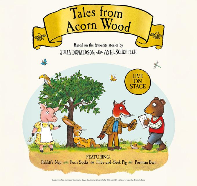 Julia Donaldson and Axel Scheffler’s beloved Tales from Acorn Wood stories are brought to life on stage for the first time in an enchanting lift-the-flap experience. Poor old Fox has lost his socks! Are they in the kitchen or inside the clock? And Rat-atat-tat! Who’s that keeping tired Rabbit awake? You can also join in with Pig and Hen’s game of hideand-seek and discover the special surprise Postman Bear is planning for his friends.