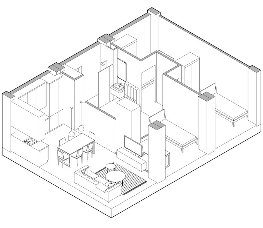 Bigger apartment designed for a couple, which consists of two combined modules.