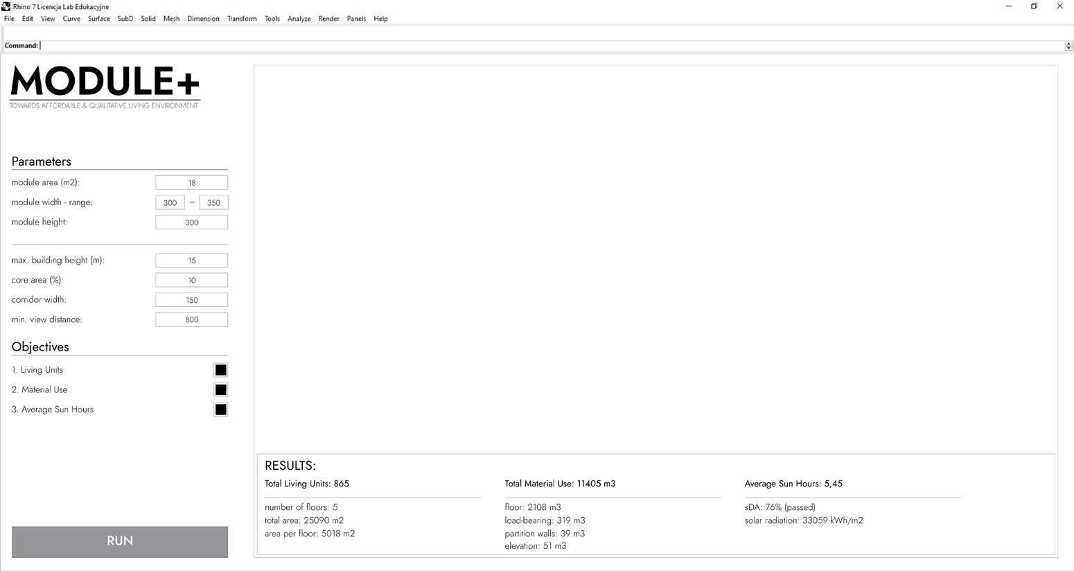 An important aspect of MODULE+ strategy is the prototype of a generative algorithm. The designer selects parameters, such as module area, dimensions, as well as objectives, which the algorithm would take in to account in the optimization process. Then, the script generates thousends of functional layouts based on prepared input, select optimal ones and ranks them based on selected objectives As a result, the designer has an overview of possible arrangements with a set of information regarding number of units, material use and total sun exposure. It does not only saves a lot of time in the entire designing process by replacing architect in the repetative task, which does not involve creativity or specialized architectural knowledge, but also provides the reliable starting point for the further design.