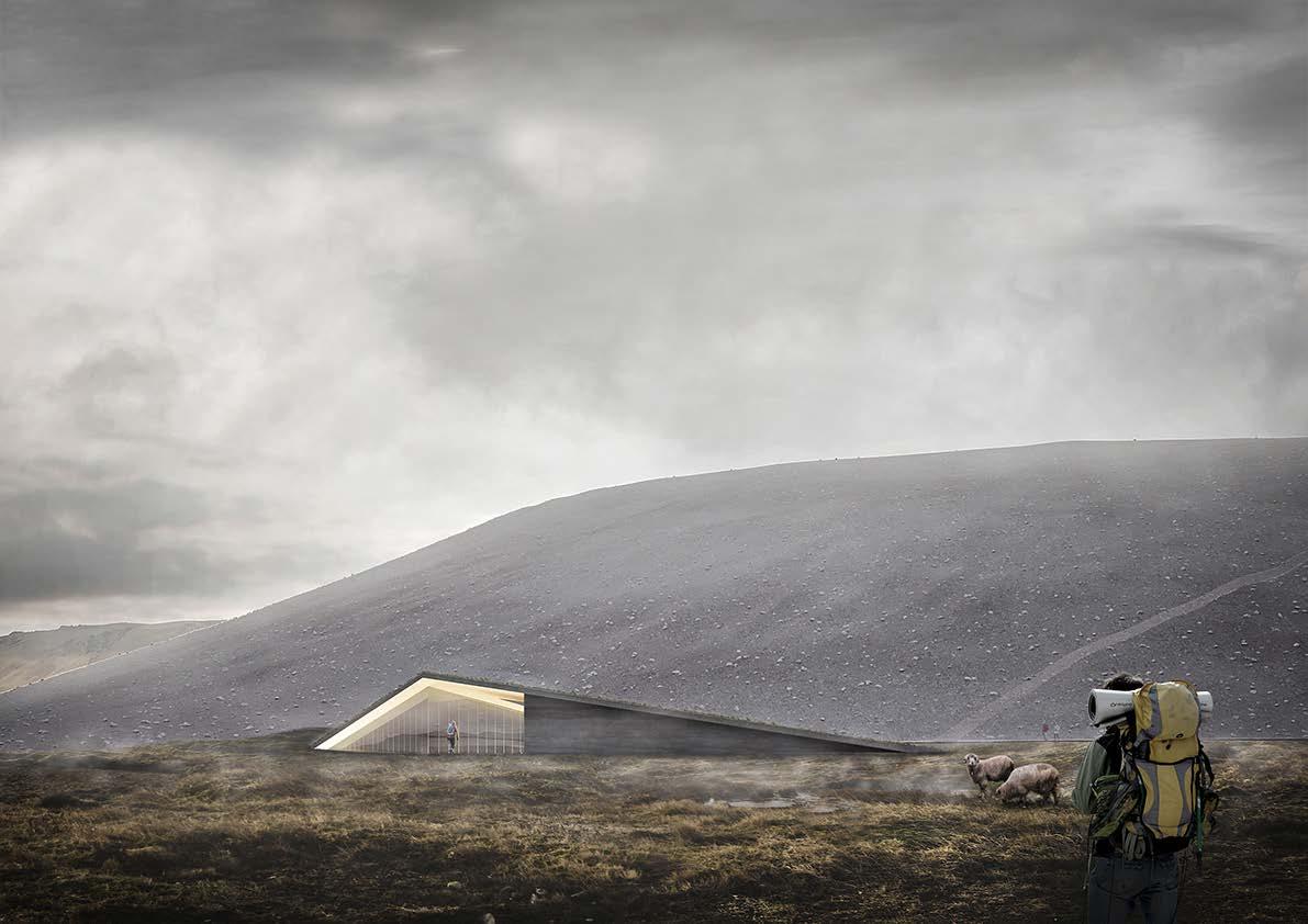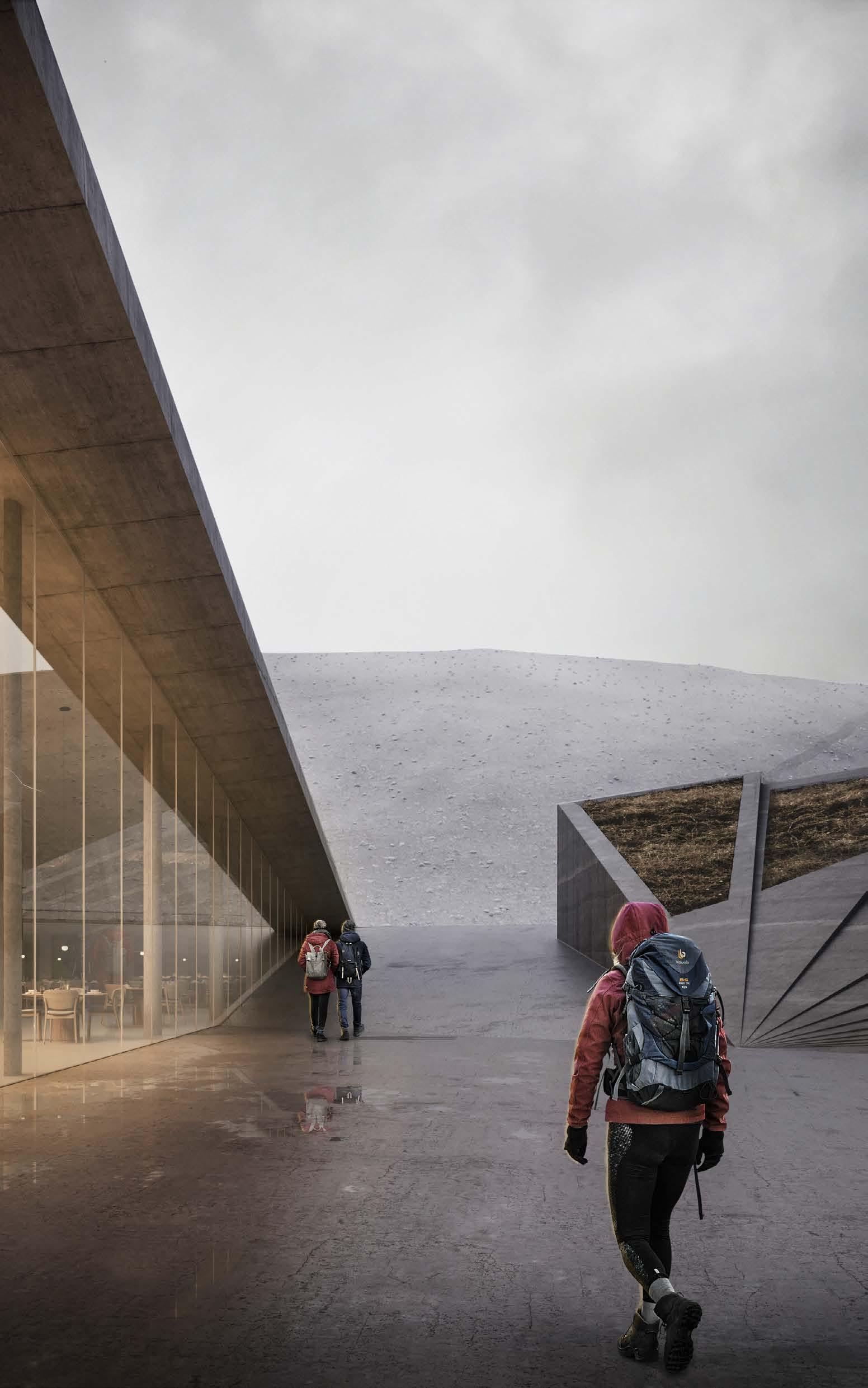 Vast grey surfaces with a rocky structure, interspersed with green mosses and lichens, which in the distance gradually transform into rough, irregular hills. Hverfjall, a high volcano in the form of a tephra cone, stands out among them. This is what the landscape of the Mývatn – region in northern Iceland – looks like. Its features were the inspiration and basis for the concept of TECTOSCAPE, a visitor centre with a coffee shop located at the foot of Hverfjall. The shape of the building imitating parting tectonic plates is buried in the ground at the intersection of the access road and the path leading to the top of the volcano. The oblique, sharp form of the building and the use of natural and commonly occurring materials in Iceland, such as turf or rammed earth, make TECTOSCAPE fit perfectly into the landscape at the same time referring to Icelandic vernacular architecture. The designed building includes an external exhibition space, landscape stairs, a building with an exhibition, a workshop space, and a coffee shop with a great skylight overlooking the volcano. This makes TECTOSCAPE the perfect place for travellers visiting Hverfjall who want to learn more about the volcano’s history or enjoy a cup of coffee while admiring the impressive volcano and the beautiful landscape of North Iceland.