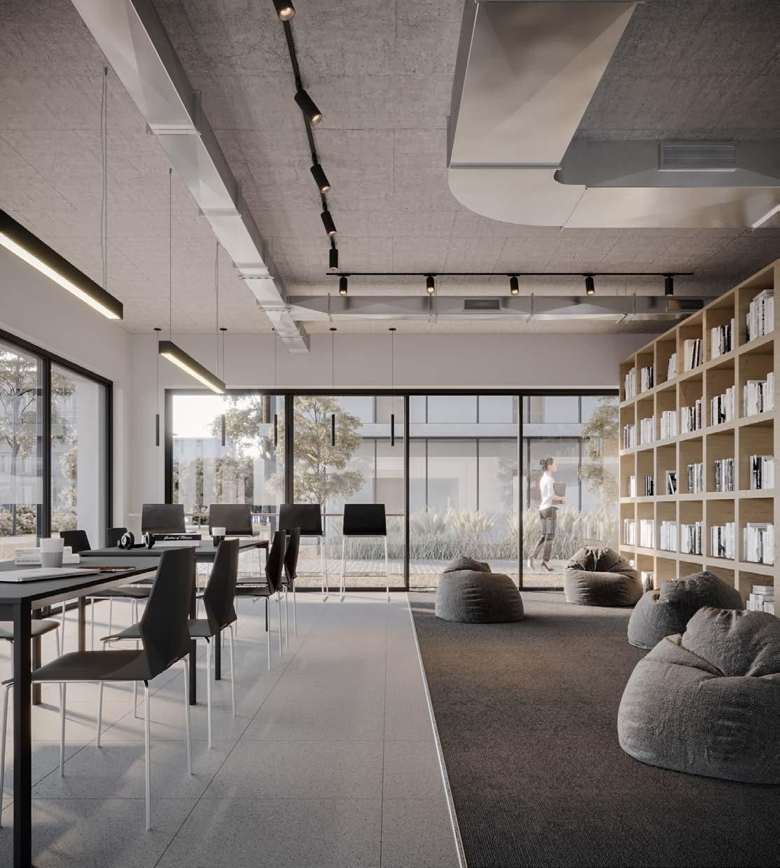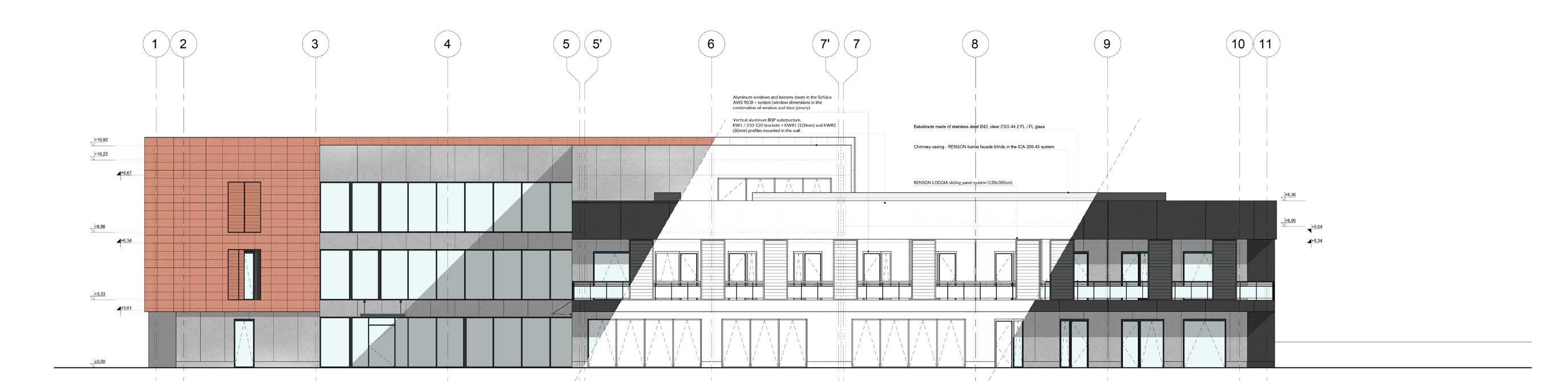 Carefully thought-out cladding of the façade in the form of raw concrete, subdued fiber-cement panels and steel elements give the building a minimalist, slightly industrial aesthetic, while the contrasting orange refers to the brick buildings of the Gdańsk University of Technology and the surrounding. Thanks to large glazing and a system of sliding blinds, the building gains a bit of modernity and dynamics. Direct contact with greenery makes the whole space alive.