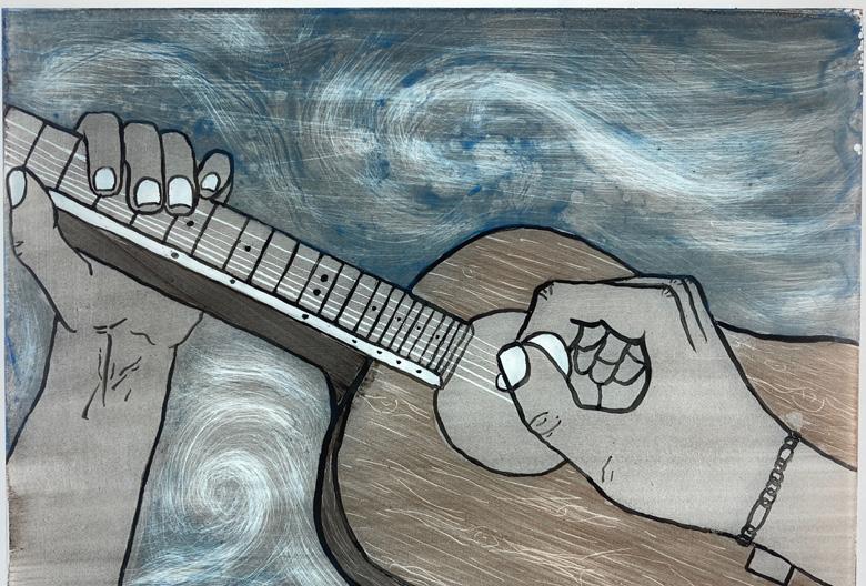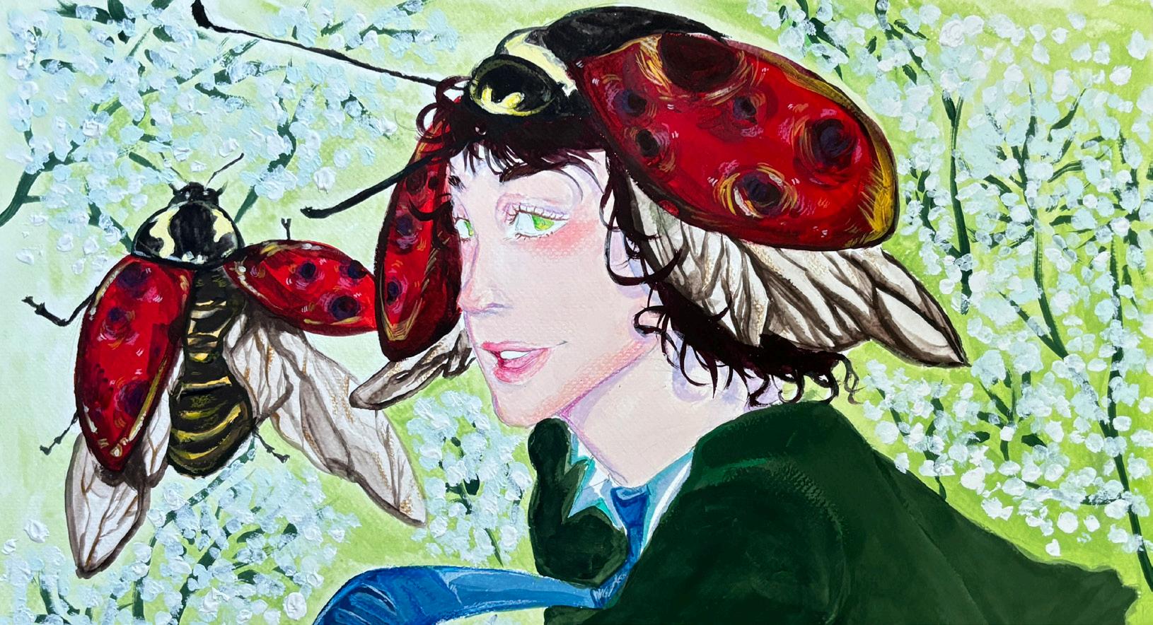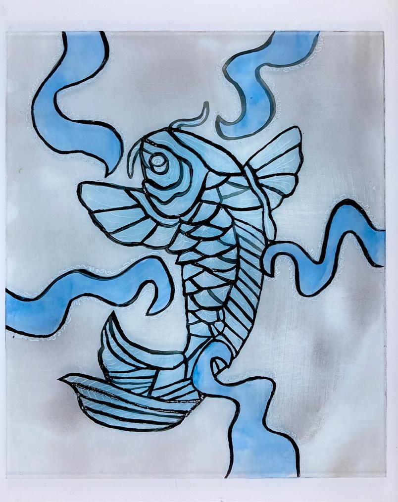 Artists clockwise from top left: Fiona Ross ’27, Claire Hu’28, Tobey Chou’26, Jude Lindley’26, Jaliyah Minor ‘26, Kaliya Muth ‘27, Jane Zhou’25, Addison Jones’26. Opposite page artwork by Matthew Ruff ’25.