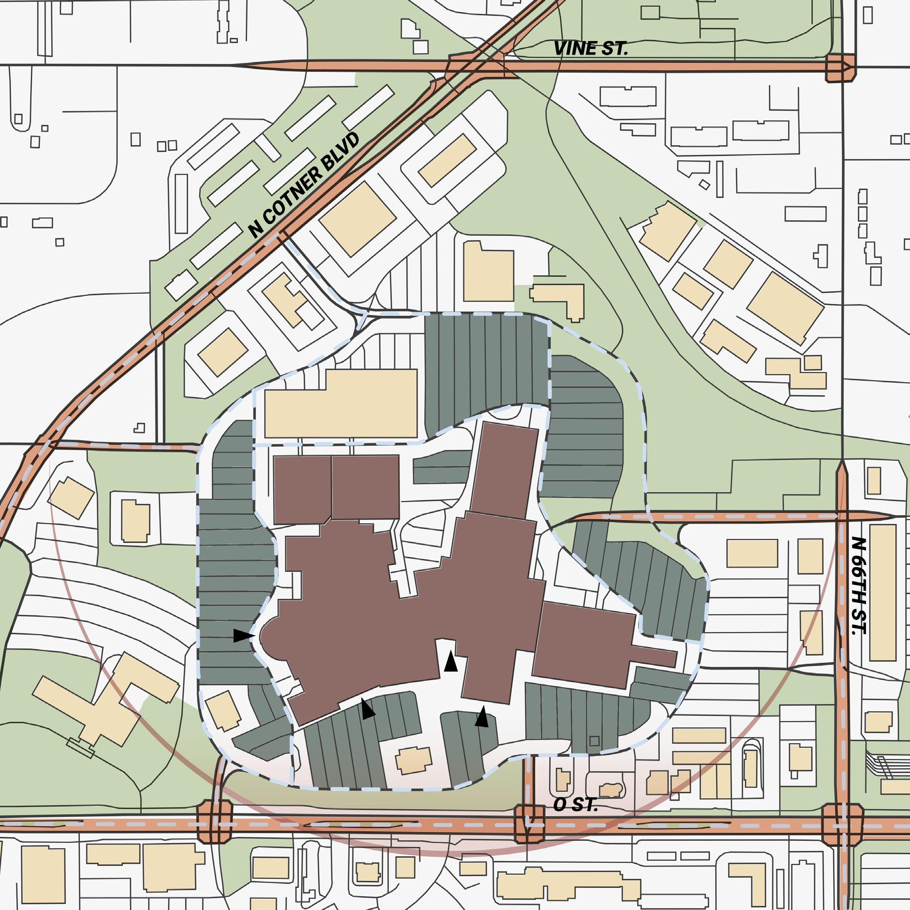 Gateway Mall is a well known landmark of the Lincoln community. The site has a location central to most of Lincoln. Downtown is directly to the West, with college campuses and high schools located all around. There are also large businesses and residential neighborhoods with community members who could have hybrid or remote work schedules. With O Street being a prime roadway, there is a lot of car traffic and vision of the site.