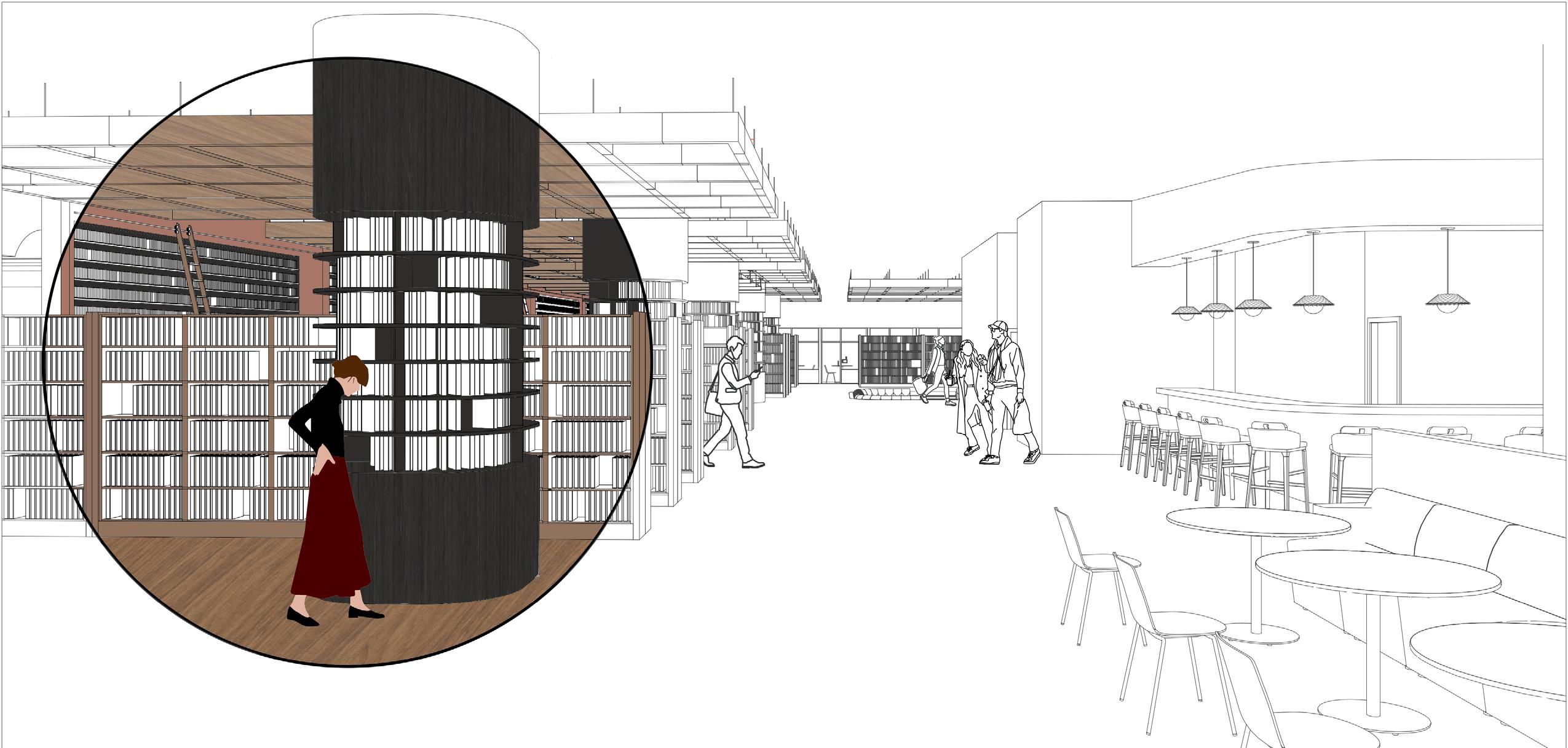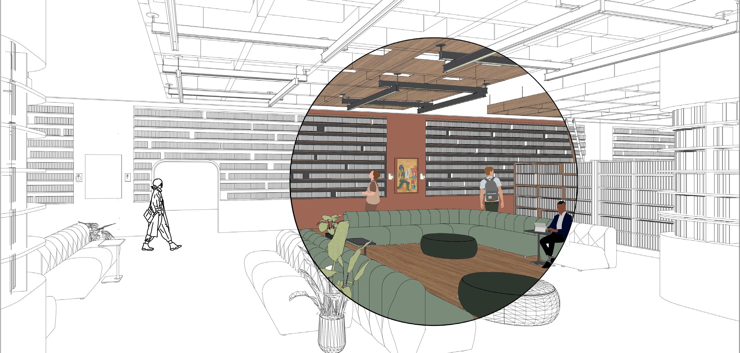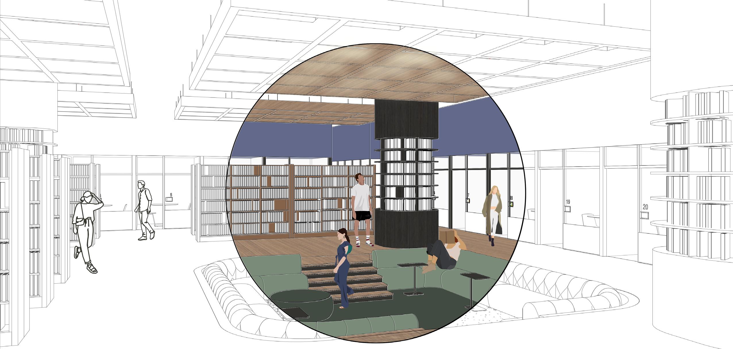 This project is an interior design proposal for the existing tenant space in Gateway Mall to be transformed into a multifunctional library and workspace. The design will establish a third place for its users, serving the needs of students, hybrid workers, and the community simultaneously. Unique interior environments accommodate the differing needs of users. These spaces will vary in sound level, lighting intensity, seating, and materiality. The central location aims to bring together many types of users to creatively address the needs of the Lincoln community.