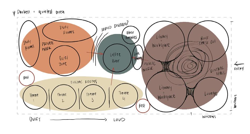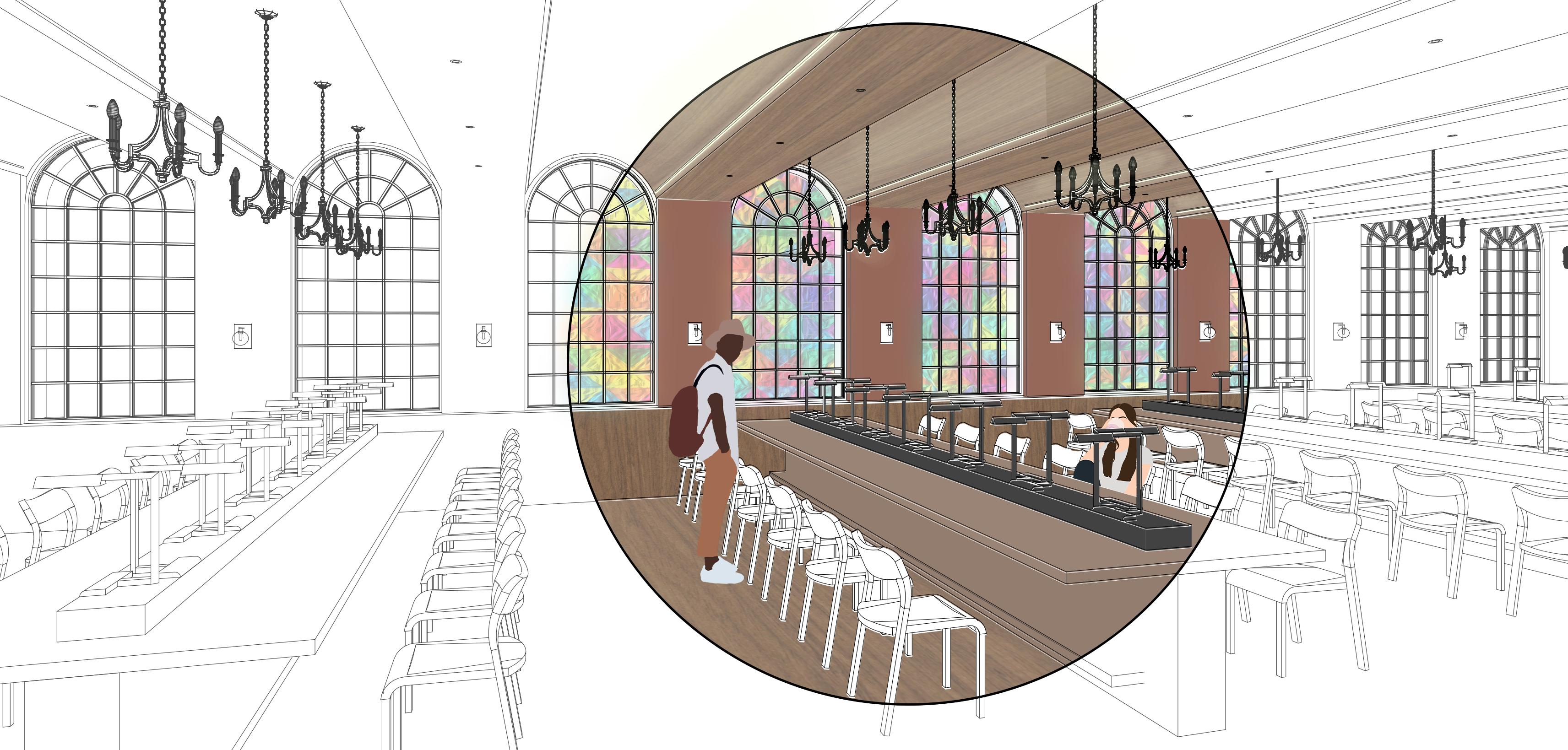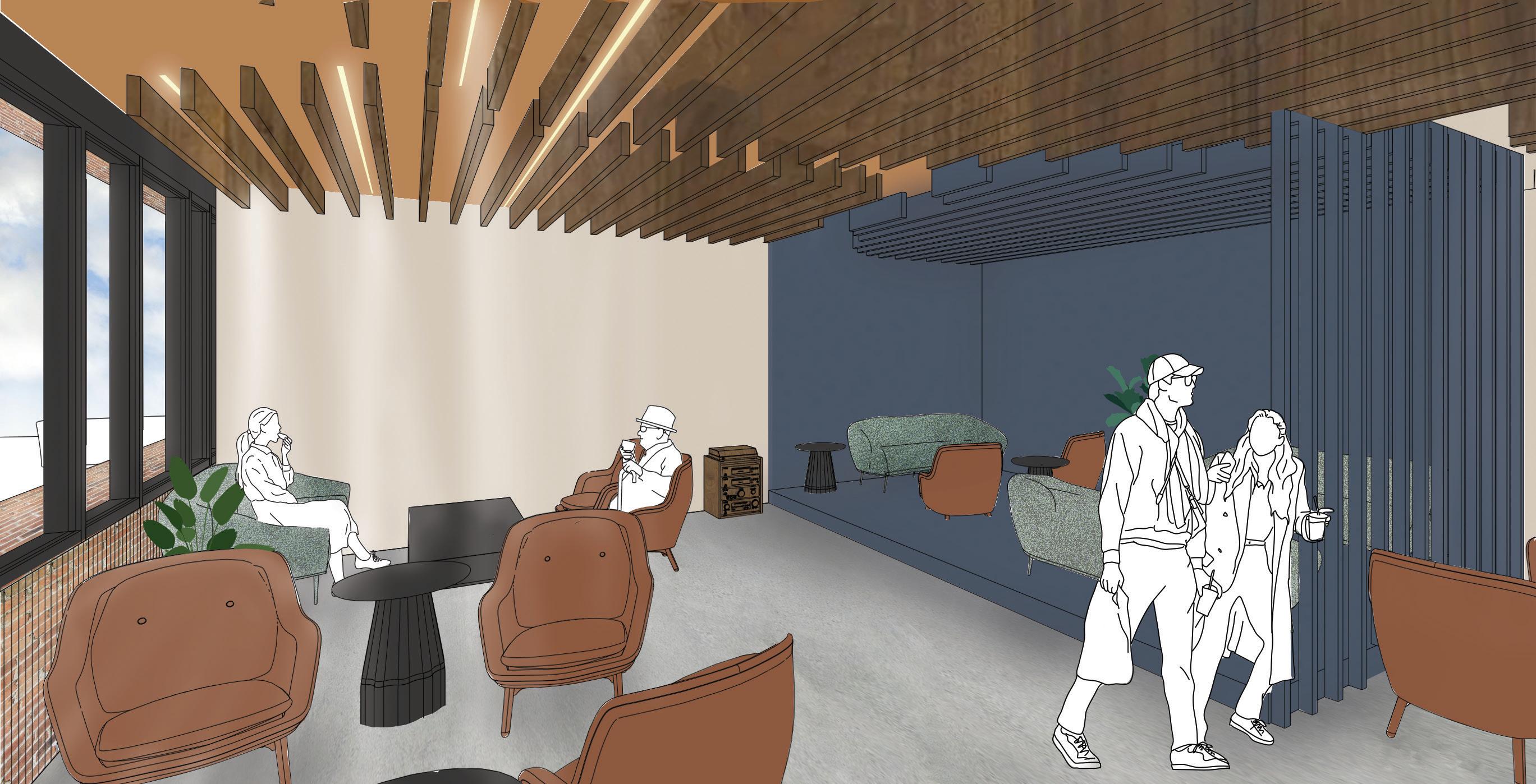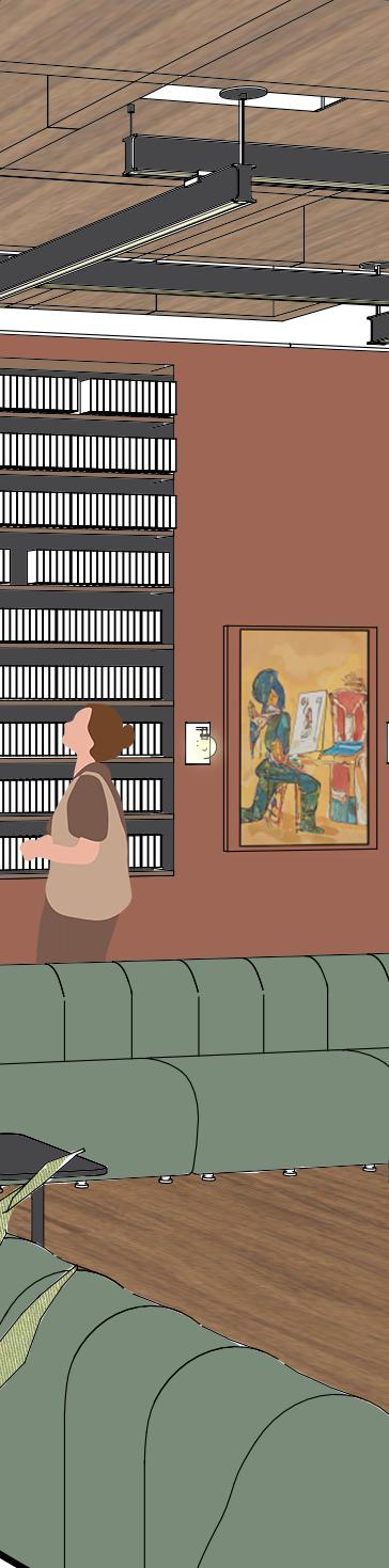 This project is an interior design proposal for the existing tenant space in Gateway Mall to be transformed into a multifunctional library and workspace. The design will establish a third place for its users, serving the needs of students, hybrid workers, and the community simultaneously. Unique interior environments accommodate the differing needs of users. These spaces will vary in sound level, lighting intensity, seating, and materiality. The central location aims to bring together many types of users to creatively address the needs of the Lincoln community.