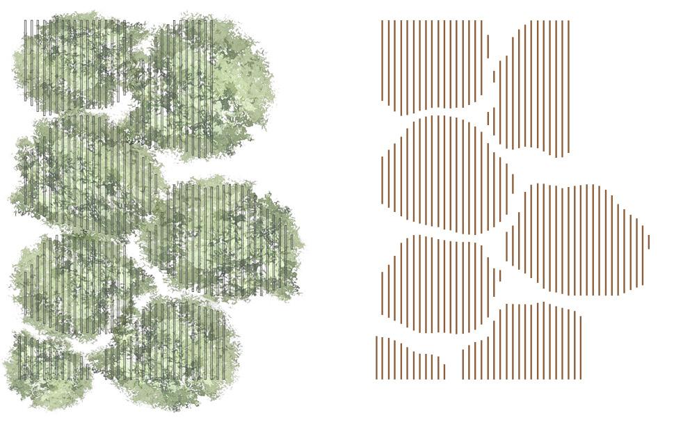 Continuing the idea of biophilia and comfort, wooden ceiling slats are oriented in a manner that mimics a tree canopy. Strip lights are also placed between slats to simulate sunlight shining through a canopy.