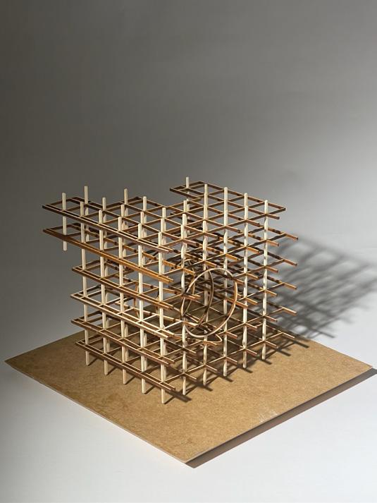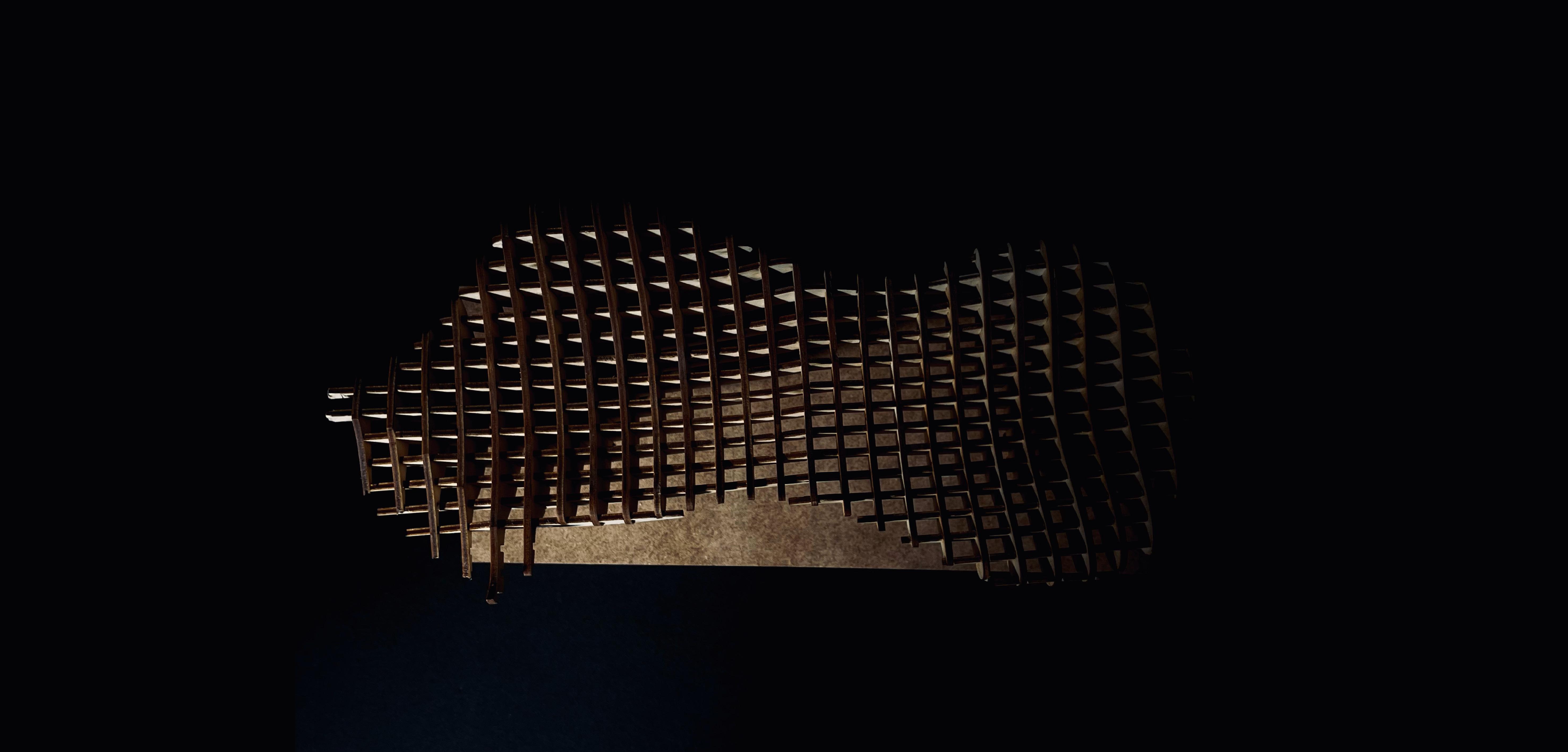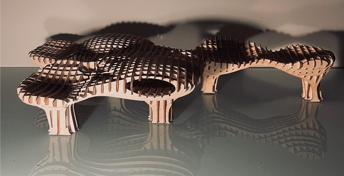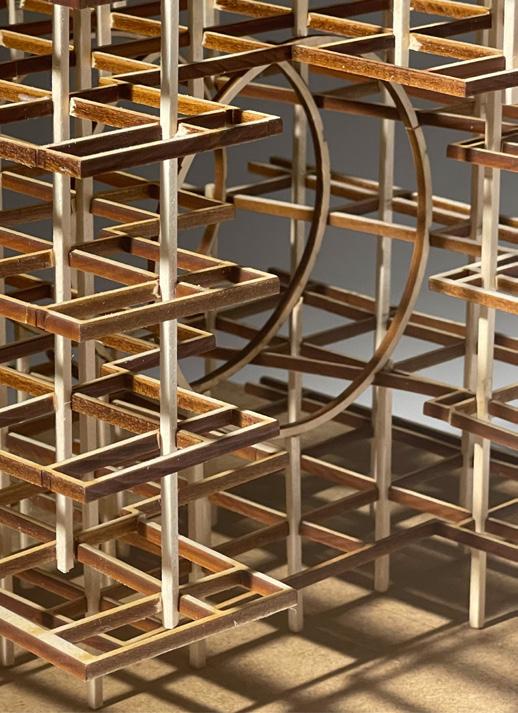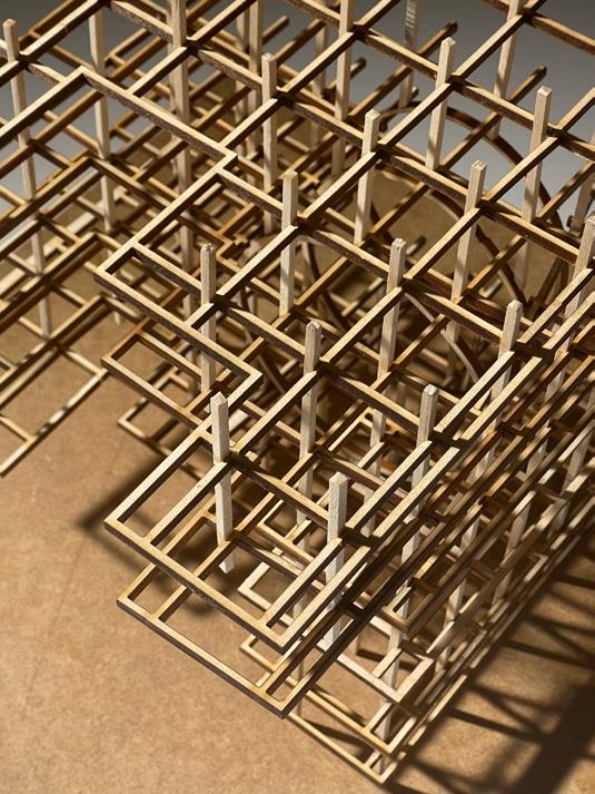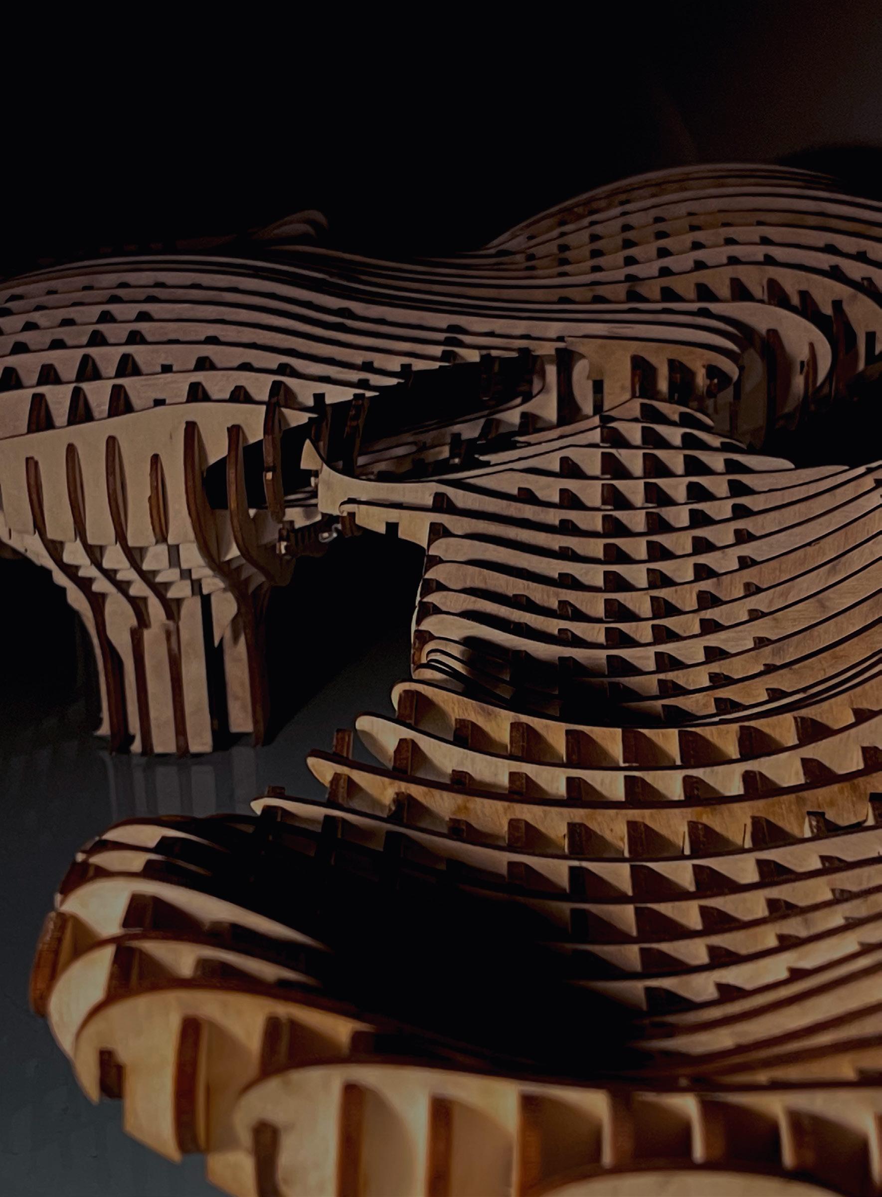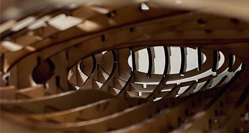 The physical model is cra�ed using a combina�on of laser cu�ng and assembly techniques, involving the careful construc�on and integra�on of over 250 wood pieces.