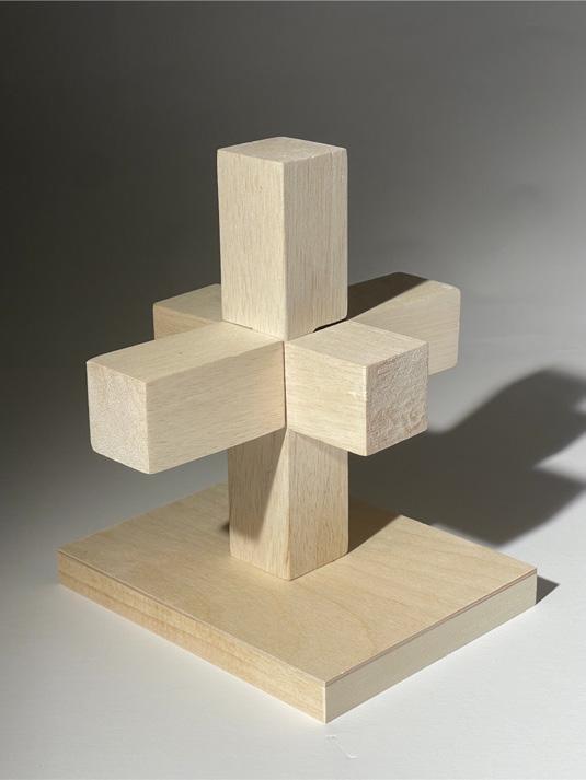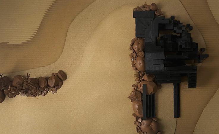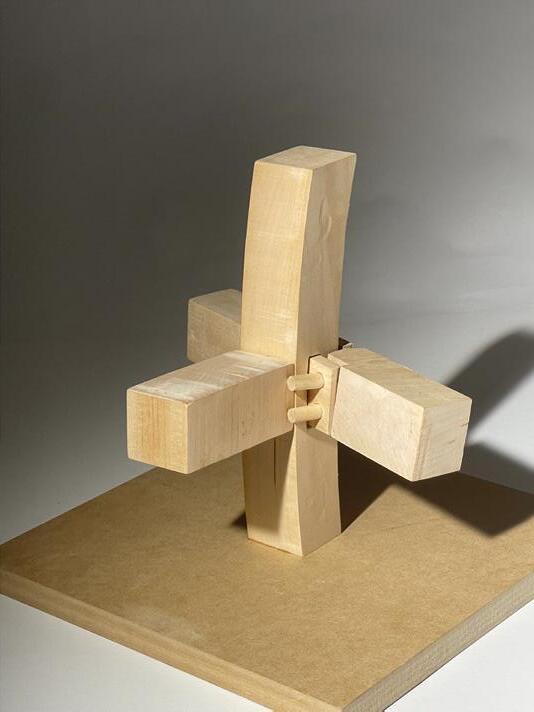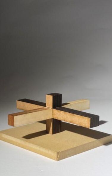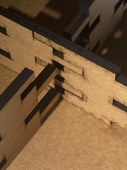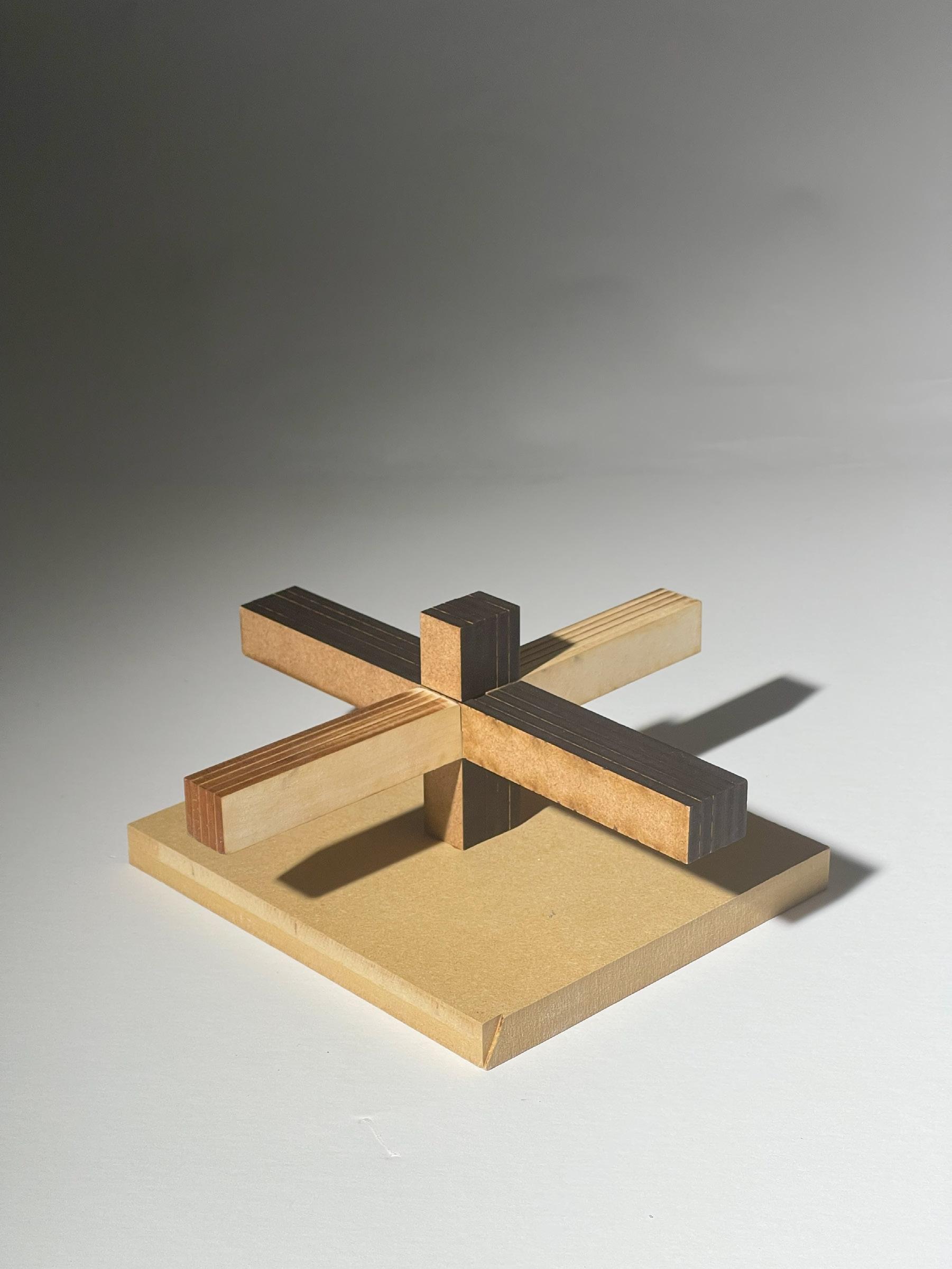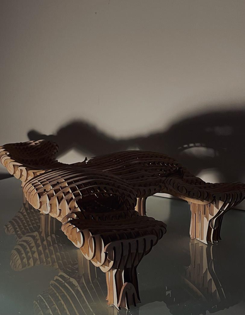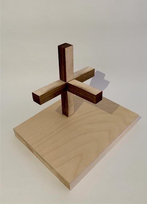 The physical model is cra�ed using a combina�on of laser cu�ng and assembly techniques, involving the careful construc�on and integra�on of over 250 wood pieces.
