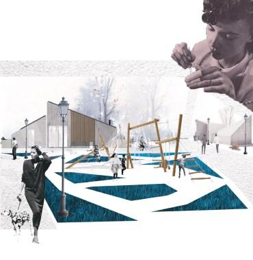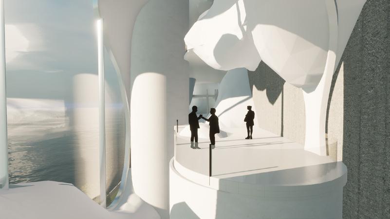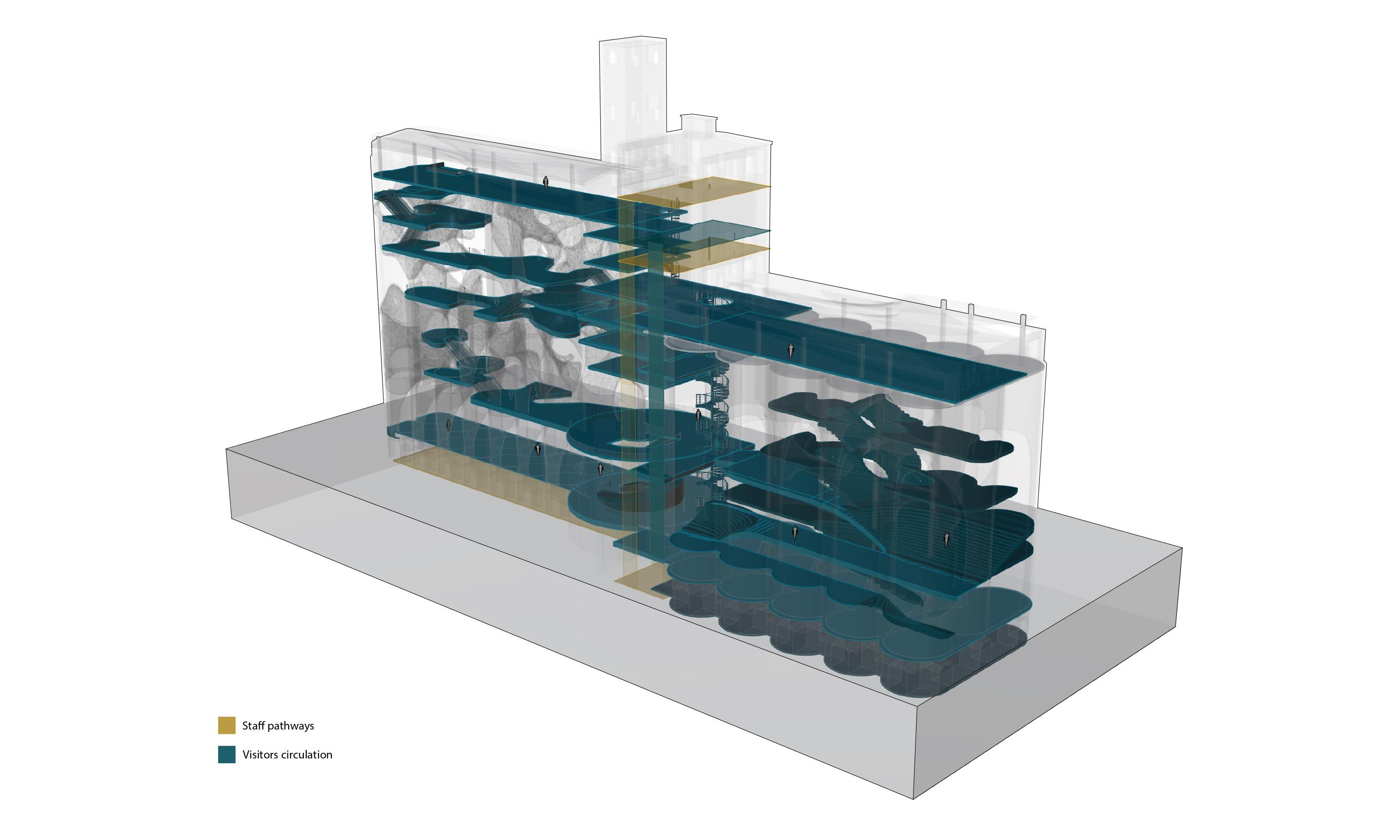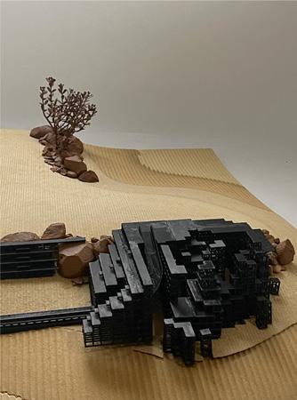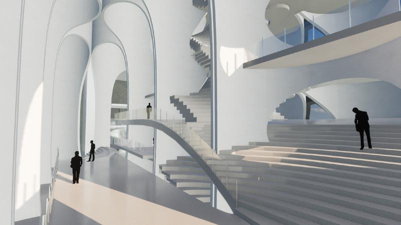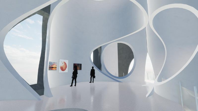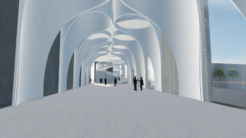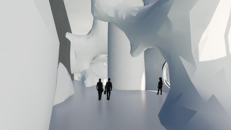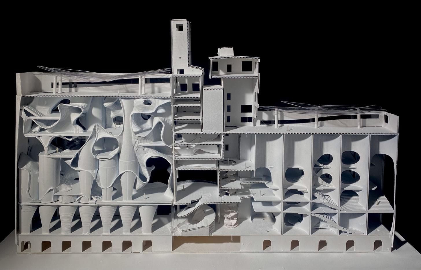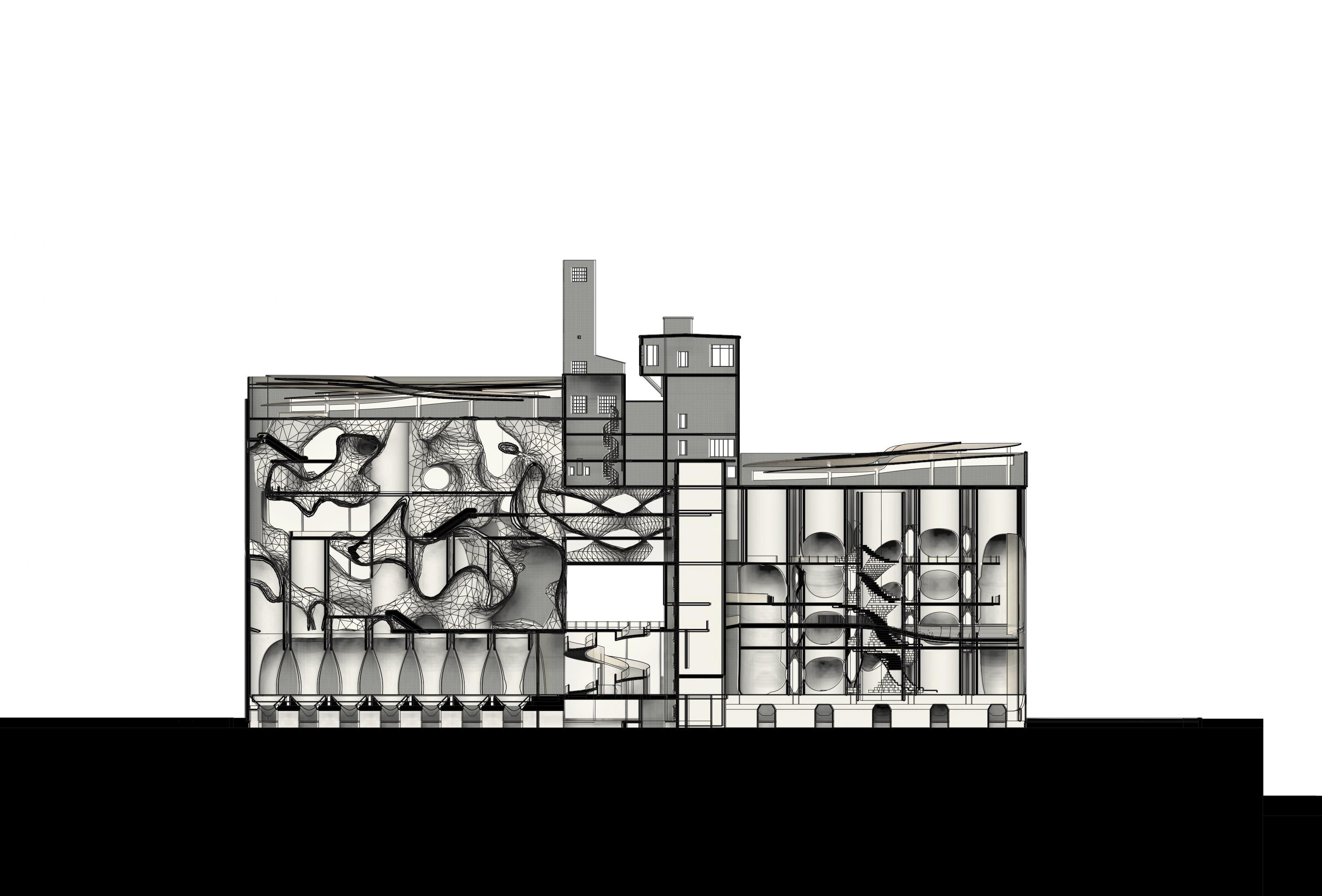 Our proposed concept for the reconstruction of the factory incorporates a combination of positive and negative architectural forms, specifically the gyroid and helicoid. The irregular gyroid structure folds upon itself, resulting in a porous and interconnected lattice-like pattern. This folding technique allows for the creation of versatile positive forms and elements, which in turn facilitate the development of smaller exhibition spaces. Despite their smaller size, these spaces maintain a sense of connection and fluidity within the overall structure. Moreover, the horizontal zoning created by the gyroid patterns produces a contrasting effect when juxtaposed with the vertical spaces of the silos.