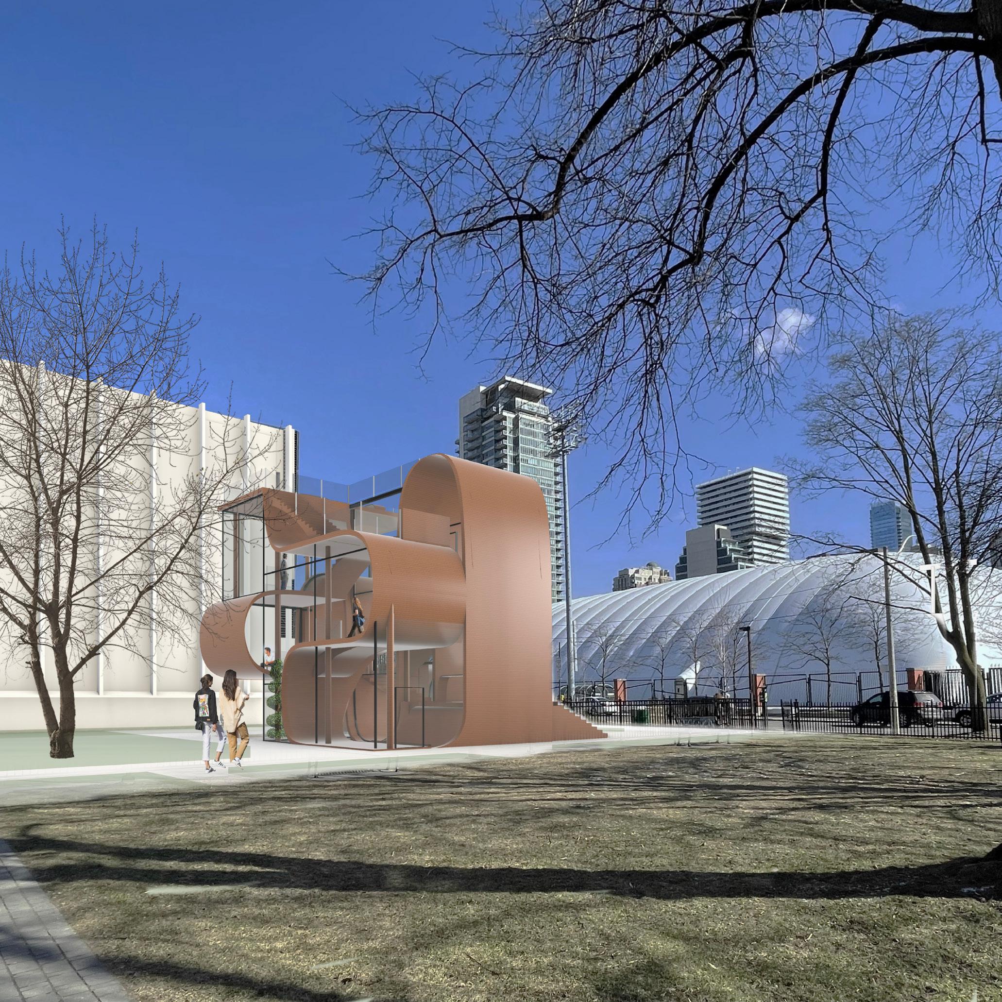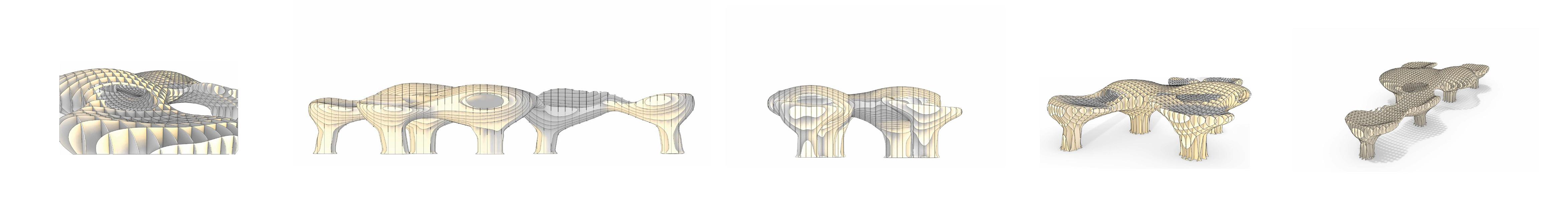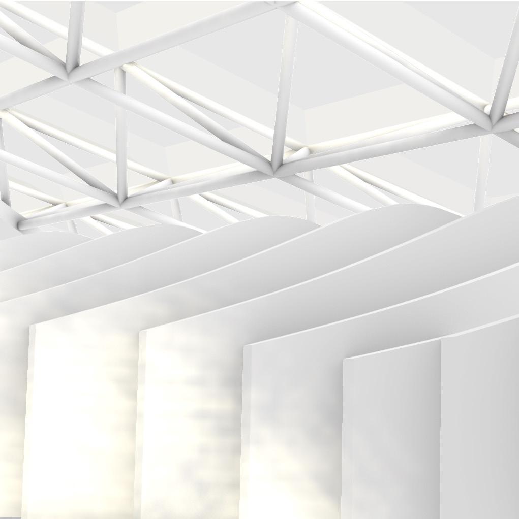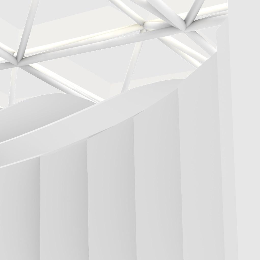 On the other hand, the helicoid represents a simplified form derived from the gyroid by subtracting space to create voids. The repetition of helicoid elements generates ample vertical space with a minimalistic approach.
