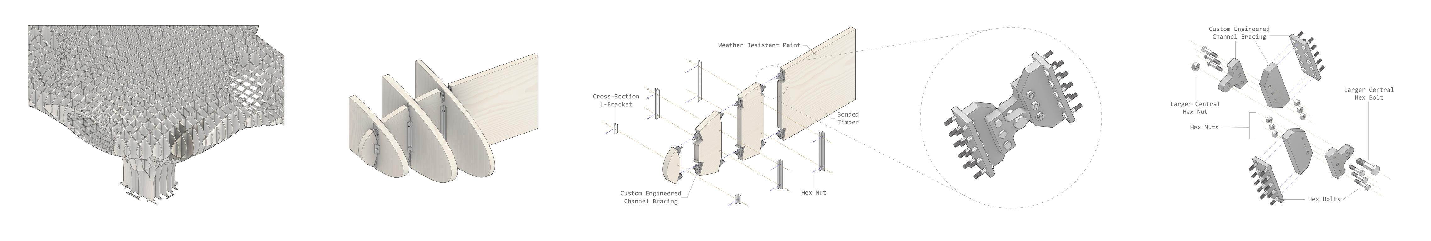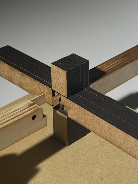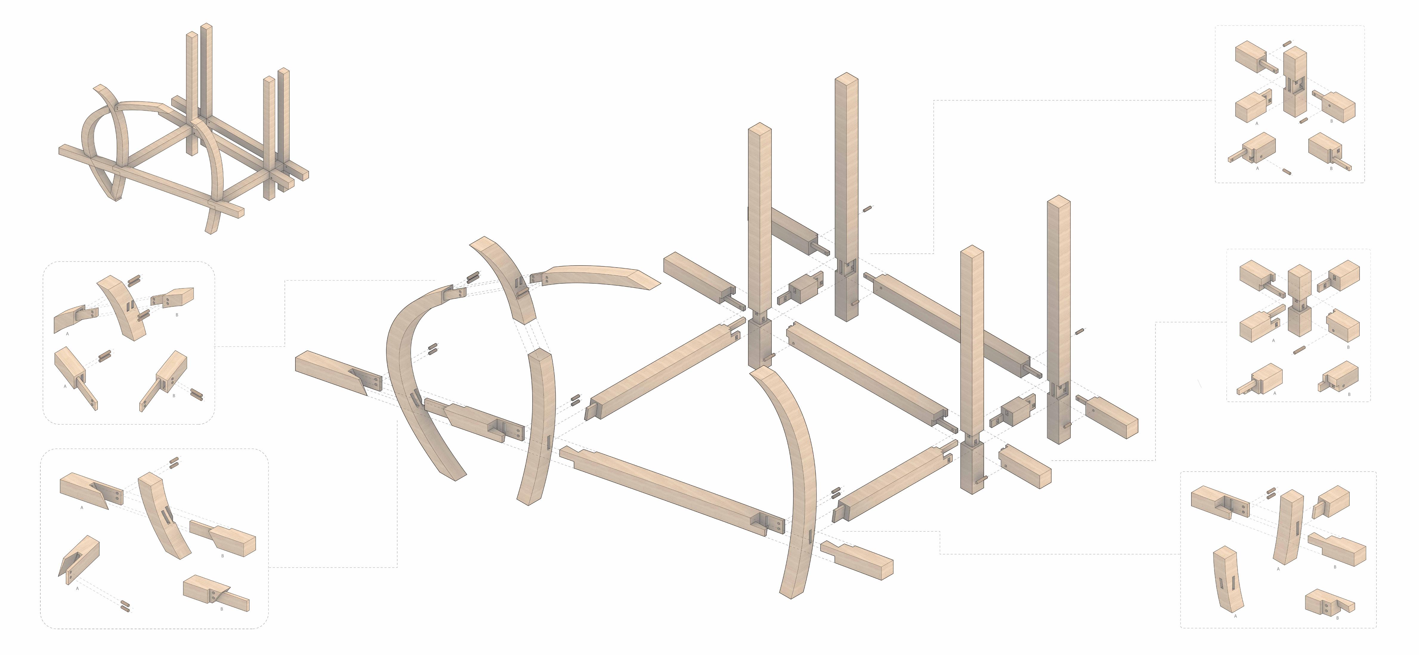 We implemented Japanese joinery principles to develop the joints in the grid system. This diagram provides a glimpse into a small section of our design, offering a closer look at the assembly's structural composition.
