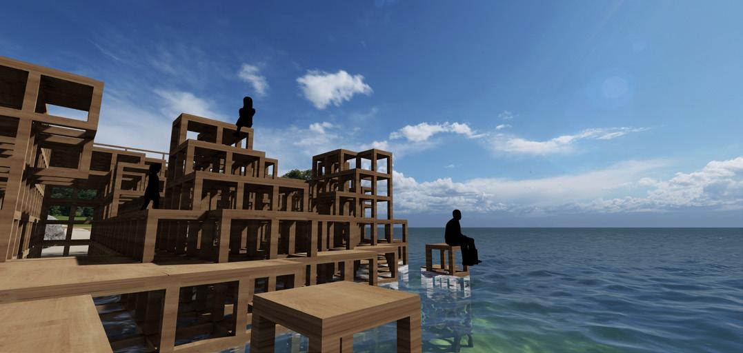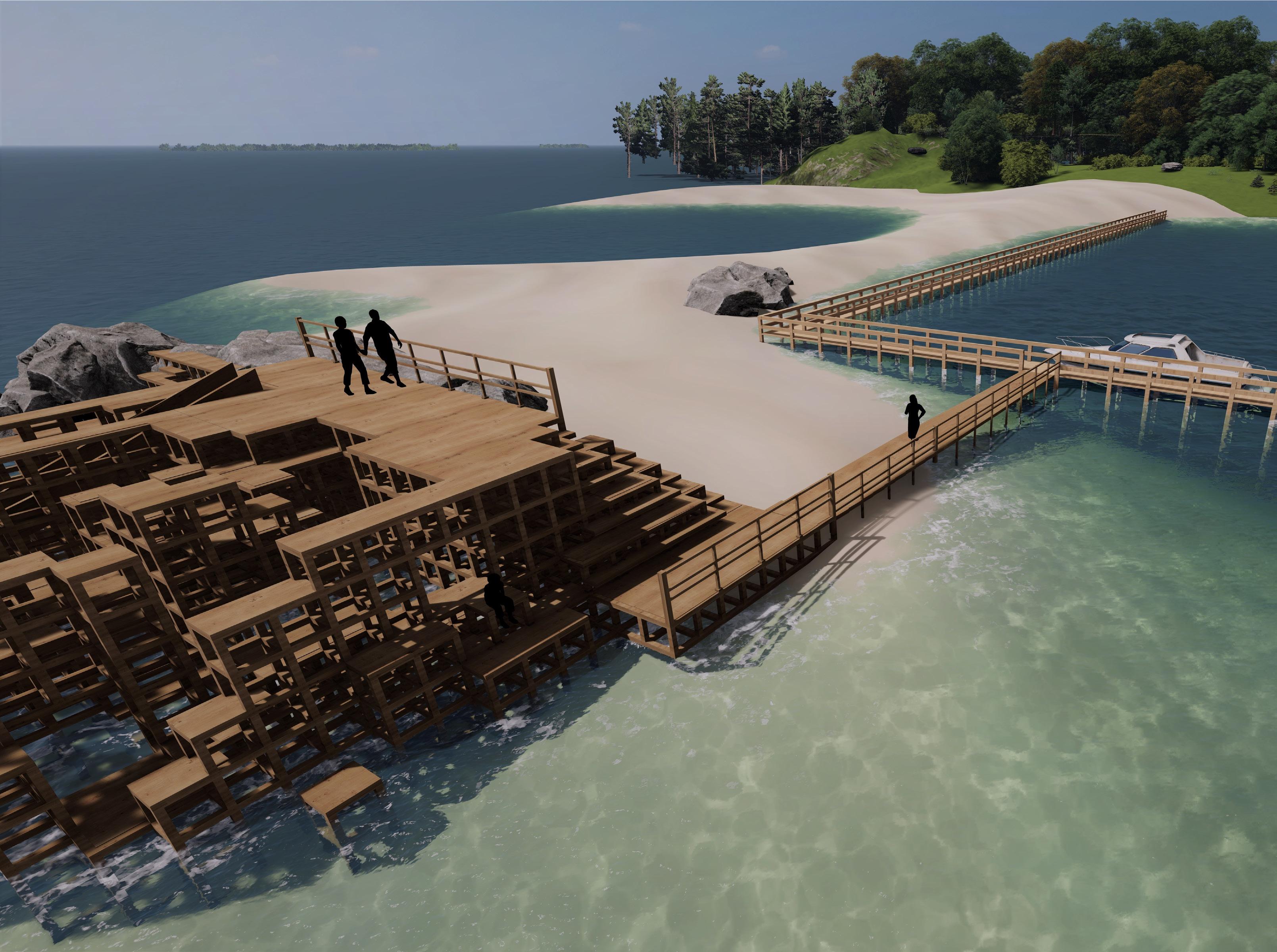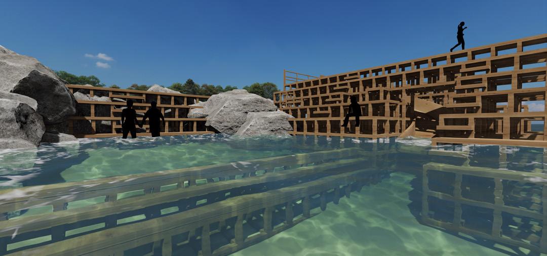 This project is centered around Beausoleil Island, a captivating destination in northern Ontario. Our site embraces the essence of camping, hiking, and swimming, with a focus on utilizing the existing lake. We have constructed a captivating playground within the tranquil embrace of its waters. As one ventures from the shore, a gentle transition unfolds, guiding visitors towards the enchanting sight of a cascading swimming pool, offering a delightful invitation to immerse oneself in the waters and embrace the joys of aquatic exploration.