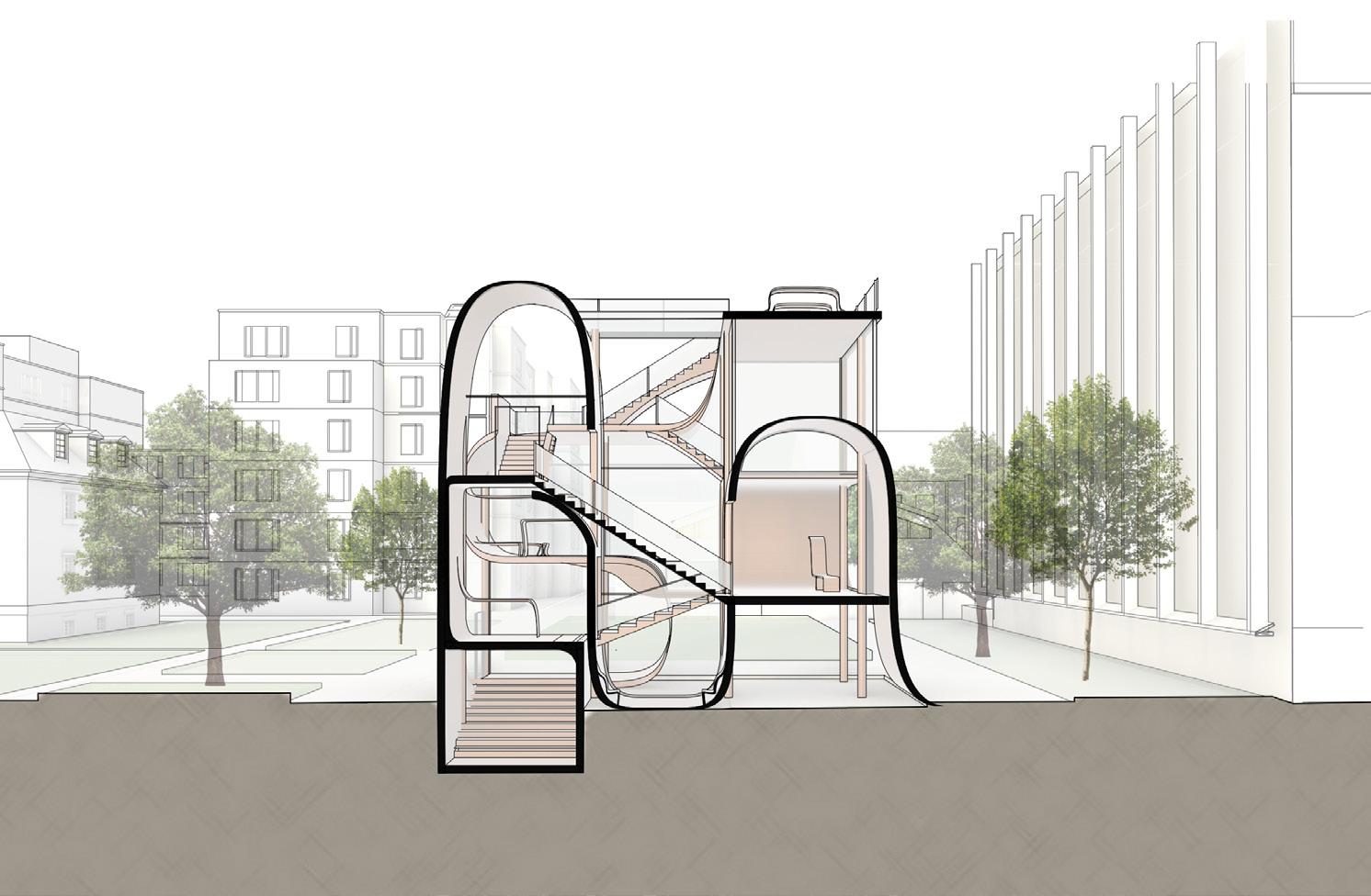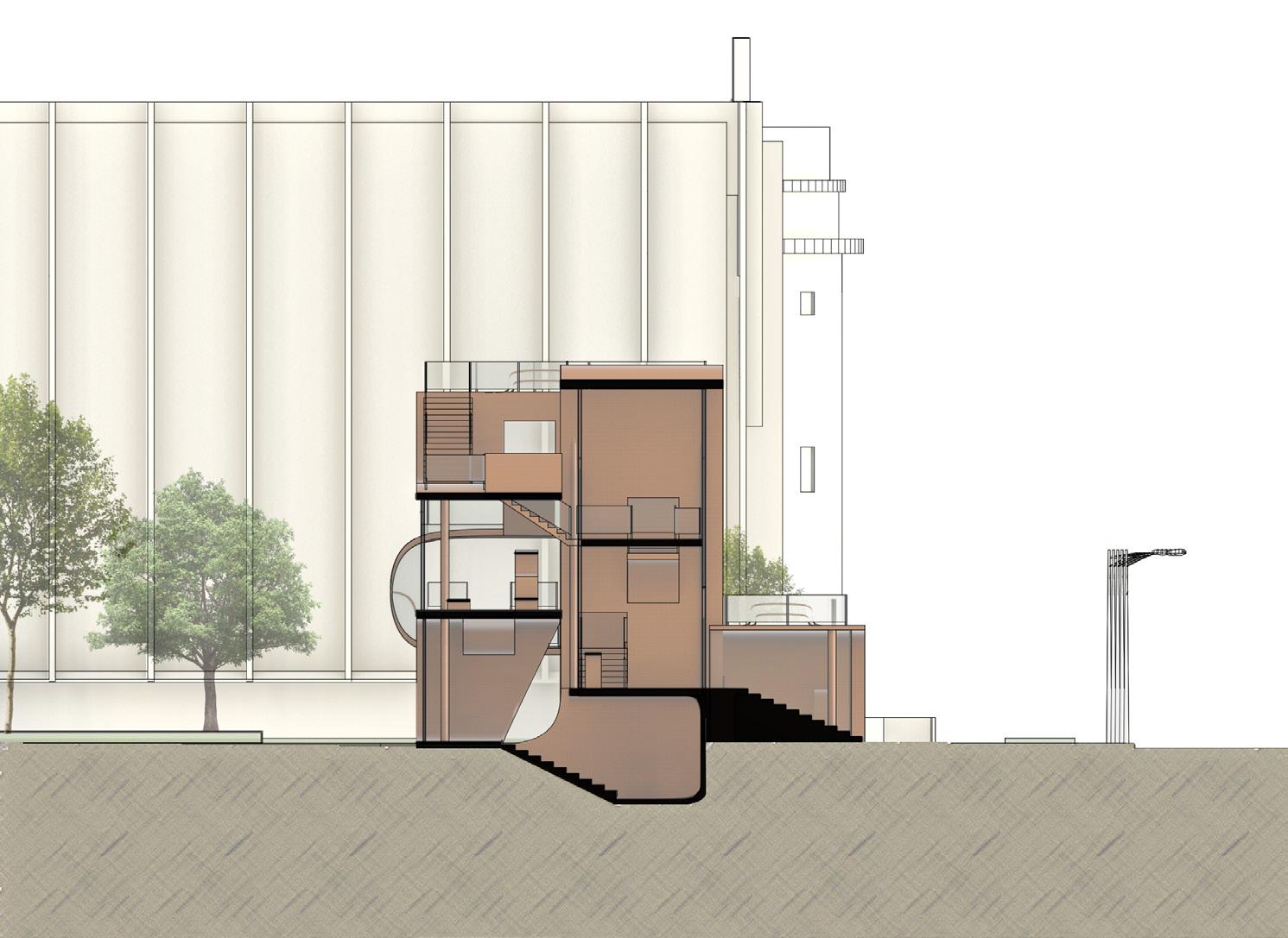 This section was taken halfway through the southern silos. It showcases the harmonious integration of the northern hallway and central lobby, seamlessly connecting both sides. Additionally, it highlights the incorporation of the silos in the southern region.