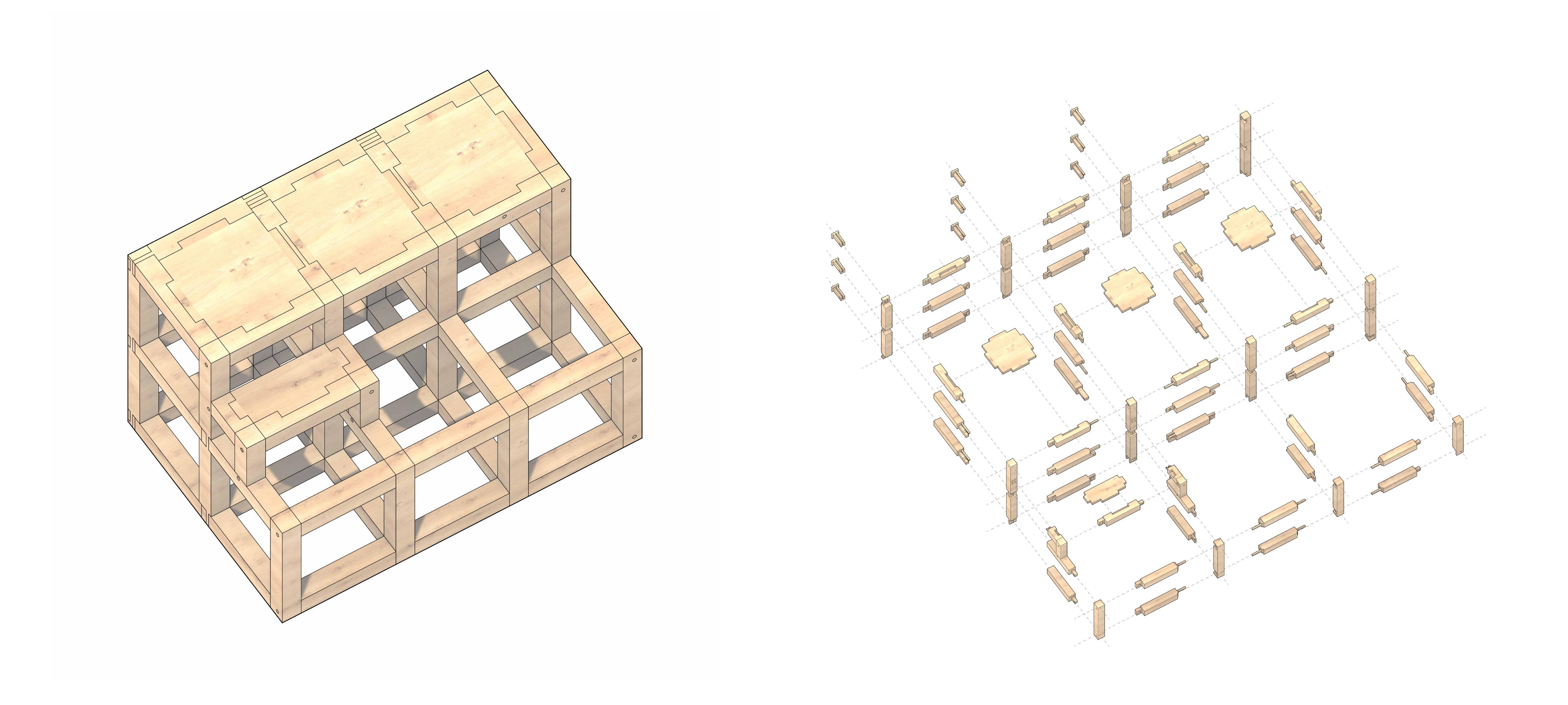 During the course of the project, the order of assembly emerged as a crucial factor in creating a new cohesive joint system. To achieve this, two main types of joints were developed, inspired by sampo-zashi on three sides and shiho-zashi joint on four sides. These joints were carefully incorporated into the design, resulting in a unique and durable structure.