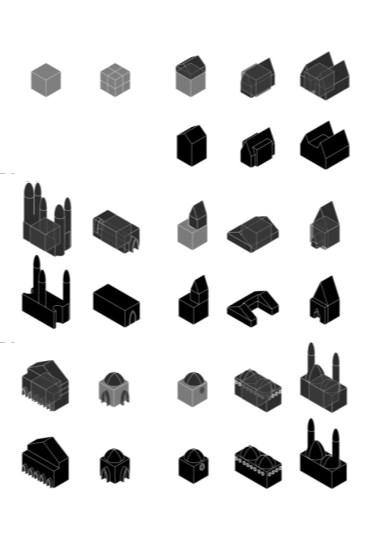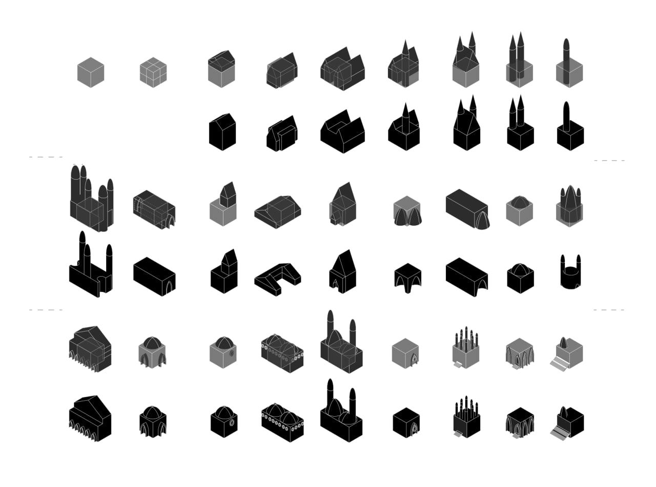 After identifying the shared formal features in the AI-generated images of existing religious buildings in Montreal, we decided to translate them into a computational program for generating secular religious forms. This composition diagram depicts the aggregated forms, with over 50 different outputs categorized into three main groups. The first group focuses on the addition of forms, while the next group showcases the subtraction of form. Additionally, the third group explores ornamentation, including arches, numerous spires, stairs, and various openings. Our observation reveals that while these buildings possess religious aesthetics, they cannot be attributed to a specific faith.