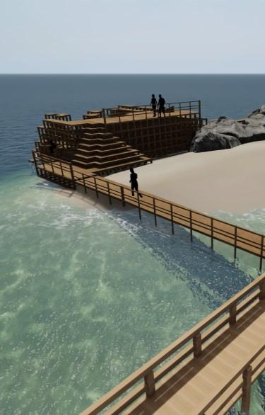 The design comprises three sections: an entrance that connects the existing bridge to our structure, a climbing area with different levels to enjoy the scenery, and a two-level swimming pool merging with the lake.