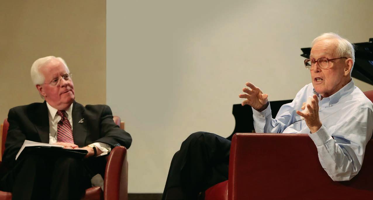 President Fleming listens to Dr. Donald E. Warren on Jan. 14, 2014, the last time Dr. Warren spoke in Chapel. pba.edu/donald-warren