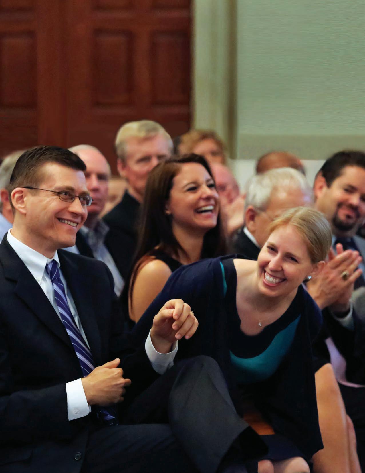 Attorney and PBA alumnus Emin Toro received good natured recognition in Chapel when he visited here in February. At right is Toro's wife Katie, also a PBA grad. Behind them is Emin's cousin Andia Luzi, a current PBA student. The Toros arranged a campus visit by a special guest: U.S. Supreme Court Justice Clarence Thomas. Story on page 16.