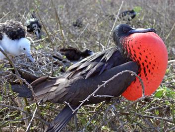 Fregata magnificens, a magnificent frigatebird, struts his stuff on the Galápagos.