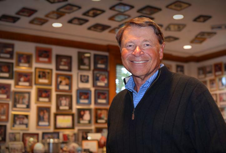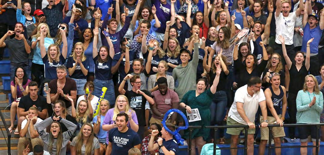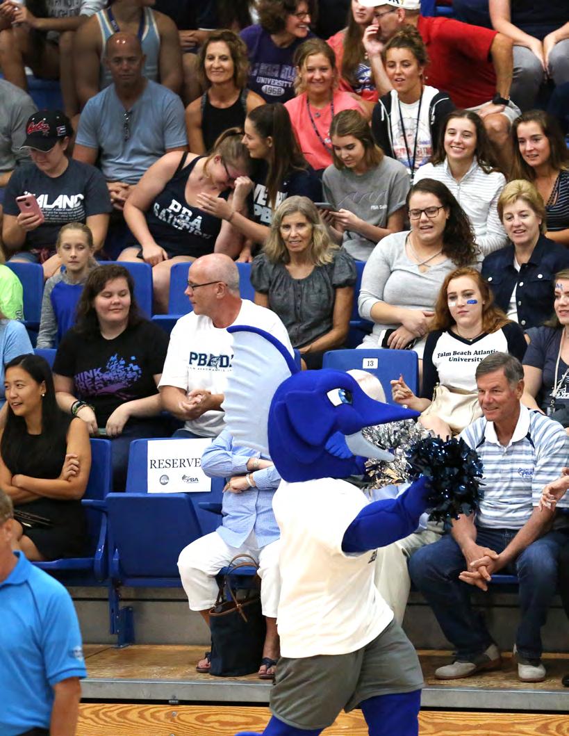A refreshed mascot debuted at the volleyball game during Family Weekend, drawing smiles from fans, including Trustee Robert Simpson, right. See other sports photos on pages 14-15, and follow all the Sailfish action online: www.pbasailfish.com