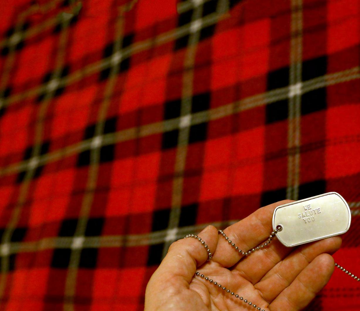 The finished blankets weigh five to seven pounds. Murchak packages them in an attractive fabric tote bag, with a handwritten card and a dog tag bearing the message “We Salute You.”