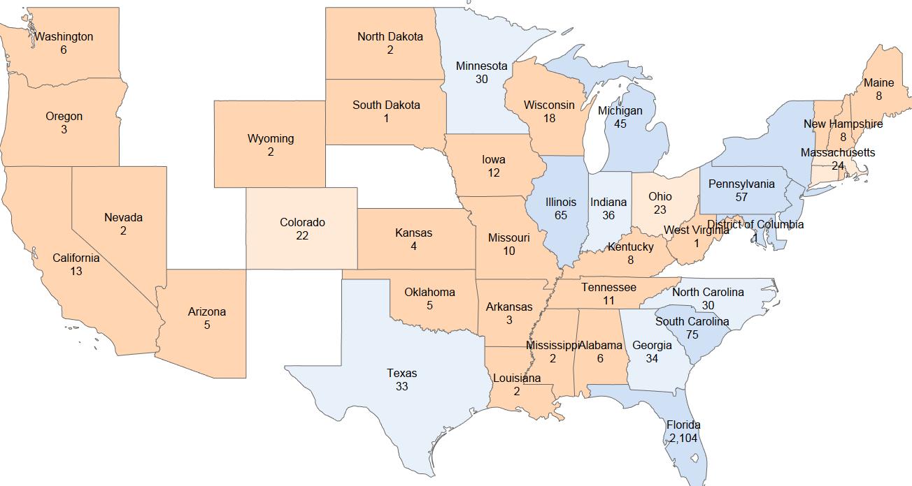 State Count State Count Florida 1336 Missouri 10 International 104 Rhode Island 9 New York 68 Maine 8 New Jersey 65 New Hampshire 8 Illinois 64 Kentucky 8 Pennsylvania 56 Alabama 6 Maryland 44 Washington 6 Albania Michigan 43 Vermont 5 Argentina Indiana 35 Arizona 5 Bahamas Georgia 32 Oklahoma 5 Barbados Texas 30 Kansas 4 Bermuda Minnesota 30 Oregon 3 North Carolina 30 Arkansas 3 Connecticut 28 Other* 2 Massachusetts 24 Wyoming 2 Ohio 23 North Dakota 2 Colorado 22 Nevada 2 Virginia 19 Louisiana 1 Wisconsin 18 Mississippi 1 South Carolina 15 West Virginia 1 Delaware 14 South Dakota 1 Iowa 12 Hawaii 1 California 11 Total 2226 Tennessee 10