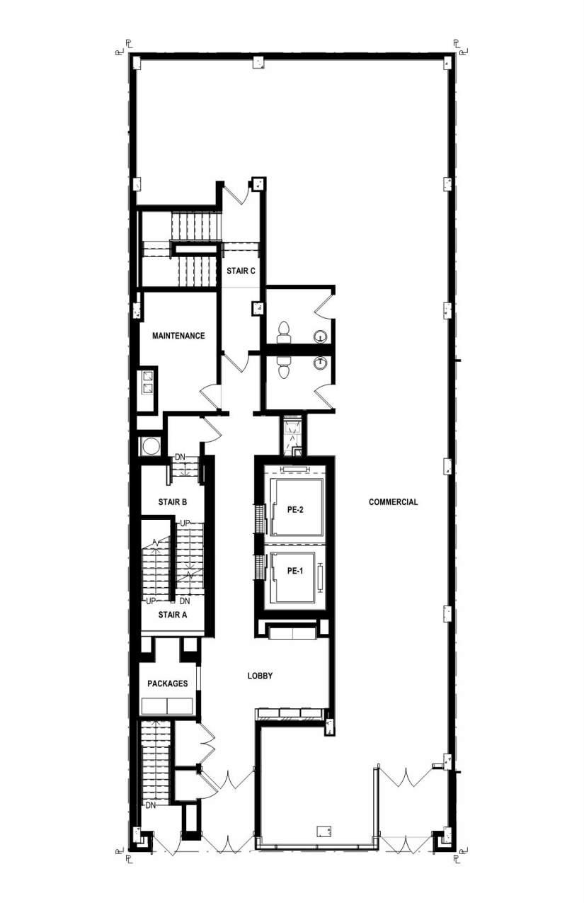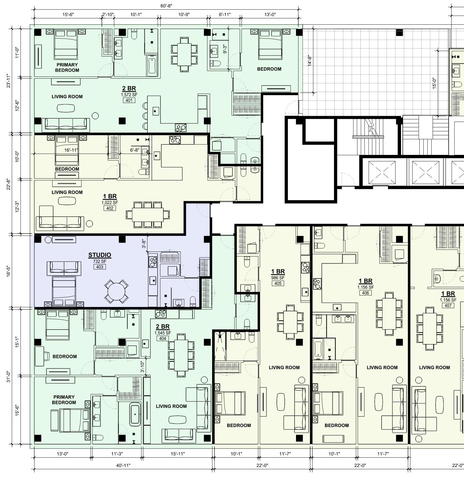 The limited width of the site demanded a very efficient core and apartment layout, utilizing every inch available. The bulk of the apartment units will be studios and 1-bedrooms with 2-bedroom units at the top floor and along the 2nd floor street façade. The ground floor will contain a rental commercial space. Outdoor recreation spaces will be provided at the 2nd floor setback roof and on the main roof.