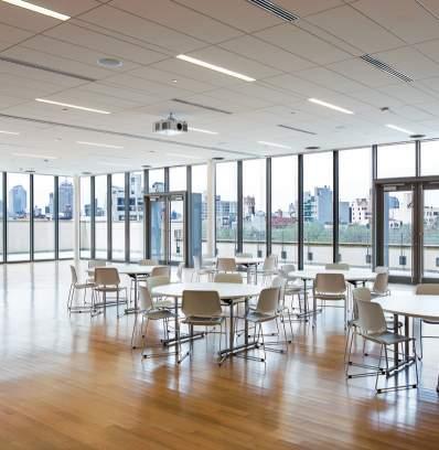 The 65,000 SF building is packed with community and religious spaces in a vertical campus spread over 14 floors. The program includes a wellness center and pool, classrooms, and flexible spaces designed to adapt to varying program needs. Religious spaces include a double-height sanctuary space and a smaller daily sanctuary, a generous library/study, and offices for the rabbinical staff. We located banquet rooms on the building’s upper floors with an outdoor terrace. This floor’s fully retractable glass wall allows events to flow seamlessly from interior to exterior.