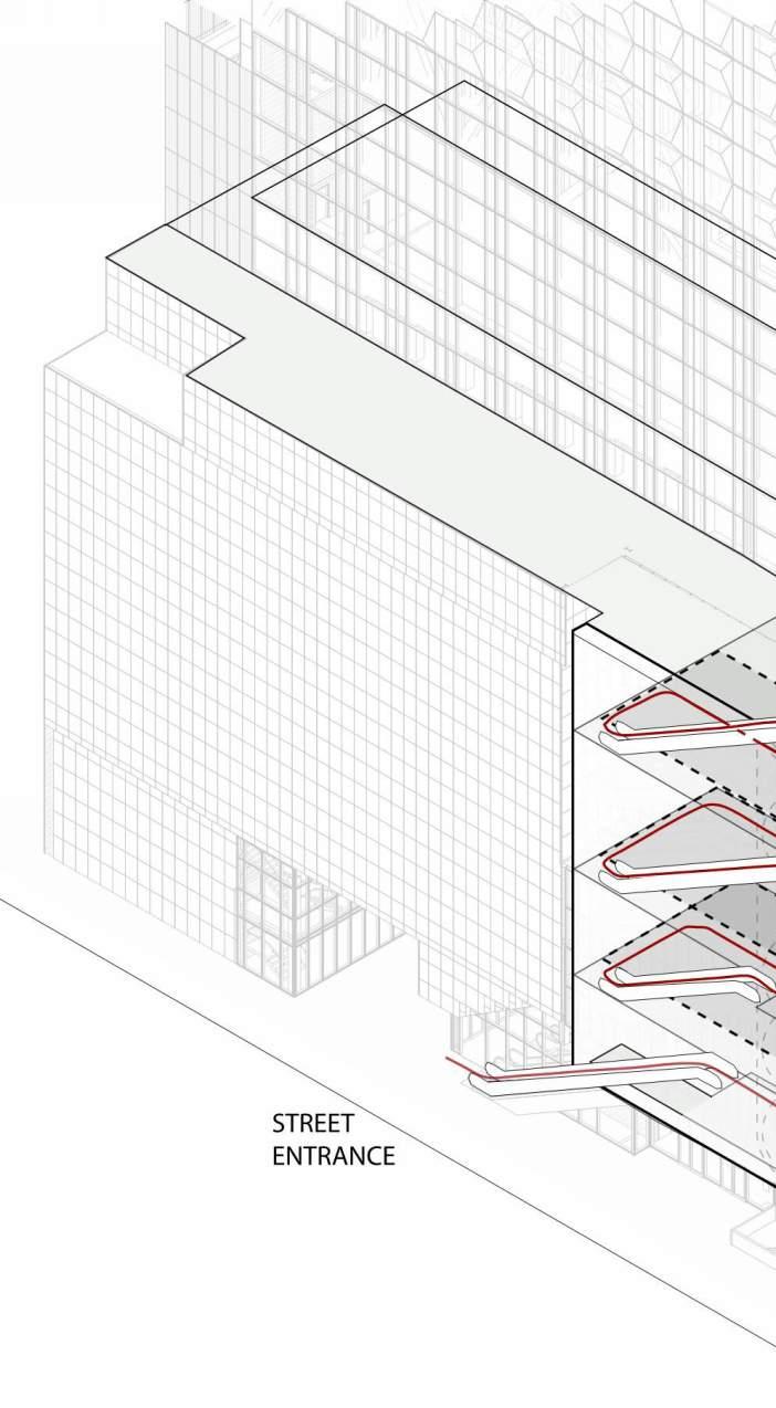 A series of articulated setbacks in the form of the building create opportunities for private residential terraces in all directions with landscaping features throughout. The new building will rest on a large 16’ deep steel truss transfer table with external columns that carry the new building loads down to the foundation. The floor level located within the steel transfer trusses will house residential amenities including social spaces, wellness areas, mechanical rooms, and egress transfer corridors and stairways.