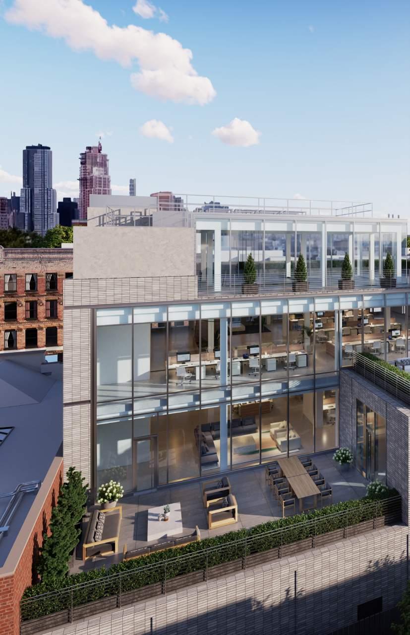 When complete, 144 Greenpoint will provide storefront space for restaurant, market, retail, or similar businesses. Accessed by a new elevator, the higher floors are designed for commercial tenants, who will enjoy plentiful natural light from floor-toceiling windows on the front and rear of the building, providing a sense of well-being along with ecological advantages. Additionally, the structure will conform to [the latest/2020] energy code standards through the use of high-performance glazing, heat pumps, advanced mechanical systems, and well-insulated walls and roof.