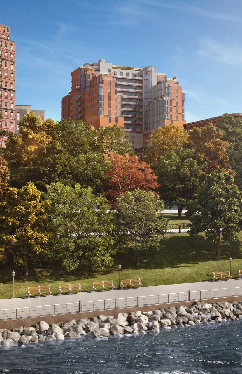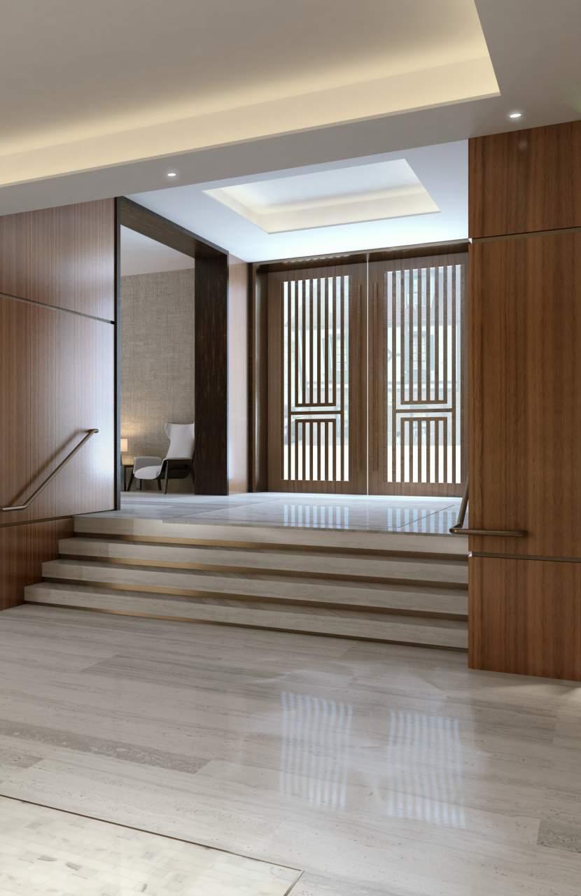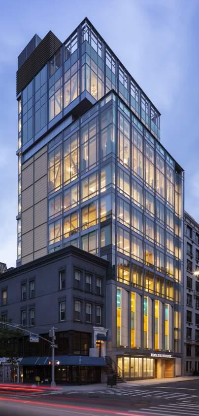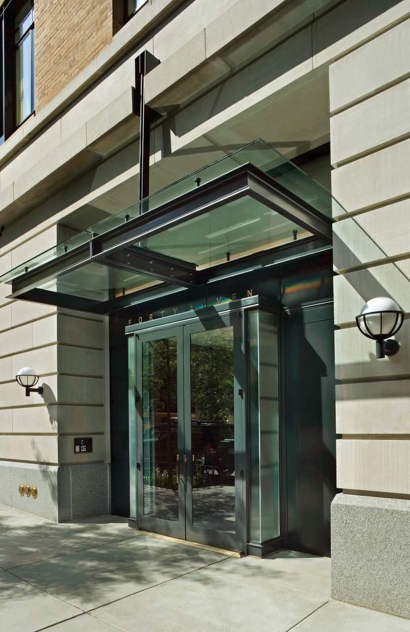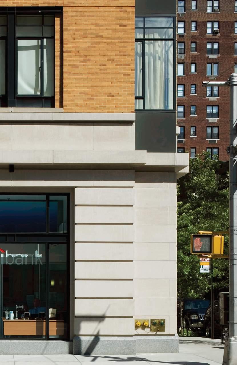 The exterior façade features extensive use of narrow sight line steel casement windows and rusticated limestone at the building base. The building is sized and proportioned to create a harmonious streetscape with the row houses, mansions, and taller apartment buildings on the avenue that are typical of the Carnegie Hill Historic District. At the same time it marks, honors and completes the north side of 91st Street where it crosses Madison Avenue, among the most distinguished streetscapes in New York City.