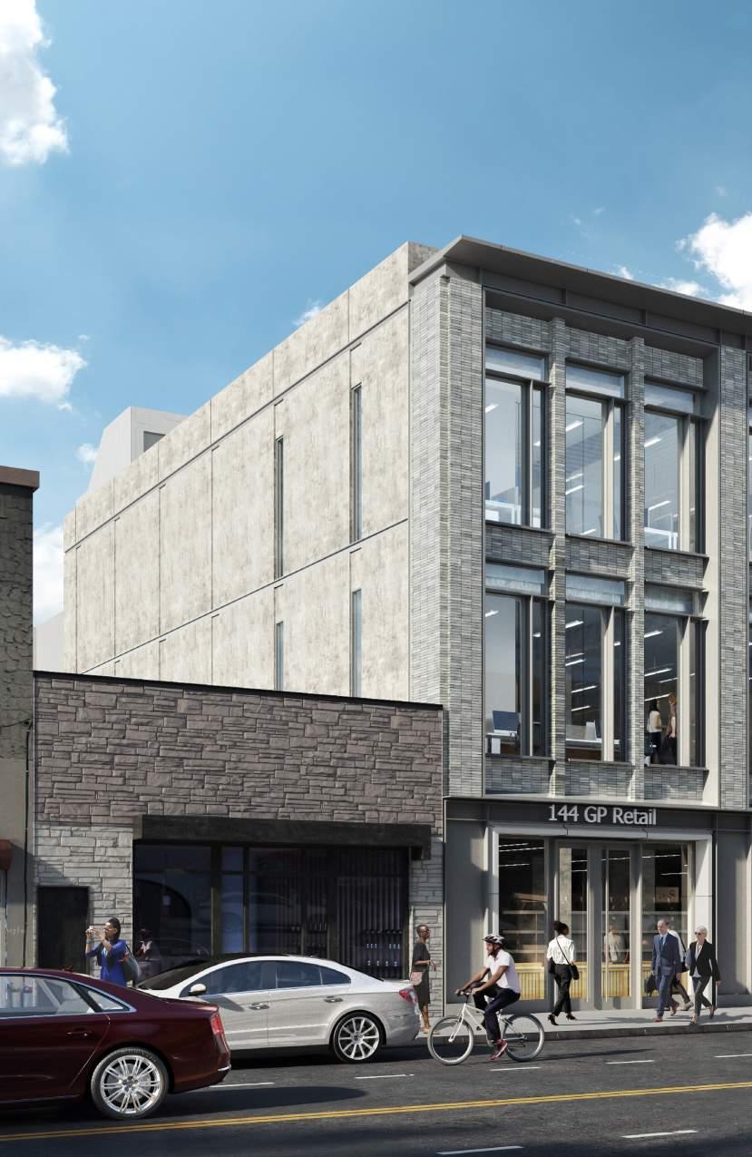 When complete, 144 Greenpoint will provide storefront space for restaurant, market, retail, or similar businesses. Accessed by a new elevator, the higher floors are designed for commercial tenants, who will enjoy plentiful natural light from floor-toceiling windows on the front and rear of the building, providing a sense of well-being along with ecological advantages. Additionally, the structure will conform to [the latest/2020] energy code standards through the use of high-performance glazing, heat pumps, advanced mechanical systems, and well-insulated walls and roof.