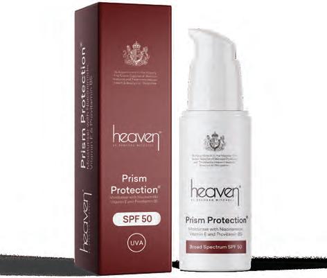 Heaven Skincare has launched Prism Protection, a broadspectrum SPF 50 moisturiser for daily, year-round use. Featuring antioxidant vitamins and multi-weight hyaluronic acid complex, the lightweight cream is formulated to glide onto the skin, adapting to all tones with a soft, velvet-matte finish. With comprehensive UV protection, it also promises to brighten and balance the skin, reduce hyperpigmentation and uneven skin tone, reduce redness and inflammation, and boost natural skin barriers.