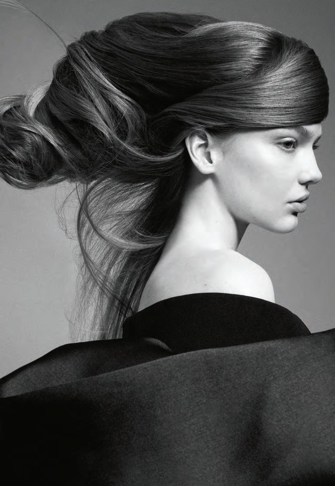 “Dynamic textures and sophisticated forms showcase an understanding of both classic and modern hairdressing techniques. Each style in the collection is meticulously crafted, blending natural textures with refined, sculptural shapes. The looks seamlessly integrate voluminous waves, playful curls and striking updos, all unified by a monochromatic palette that emphasises the hair’s intricate details and movement. The collection exudes a sense of motion and grace, capturing both the essence of timeless beauty and the spirit of cutting-edge fashion.”
