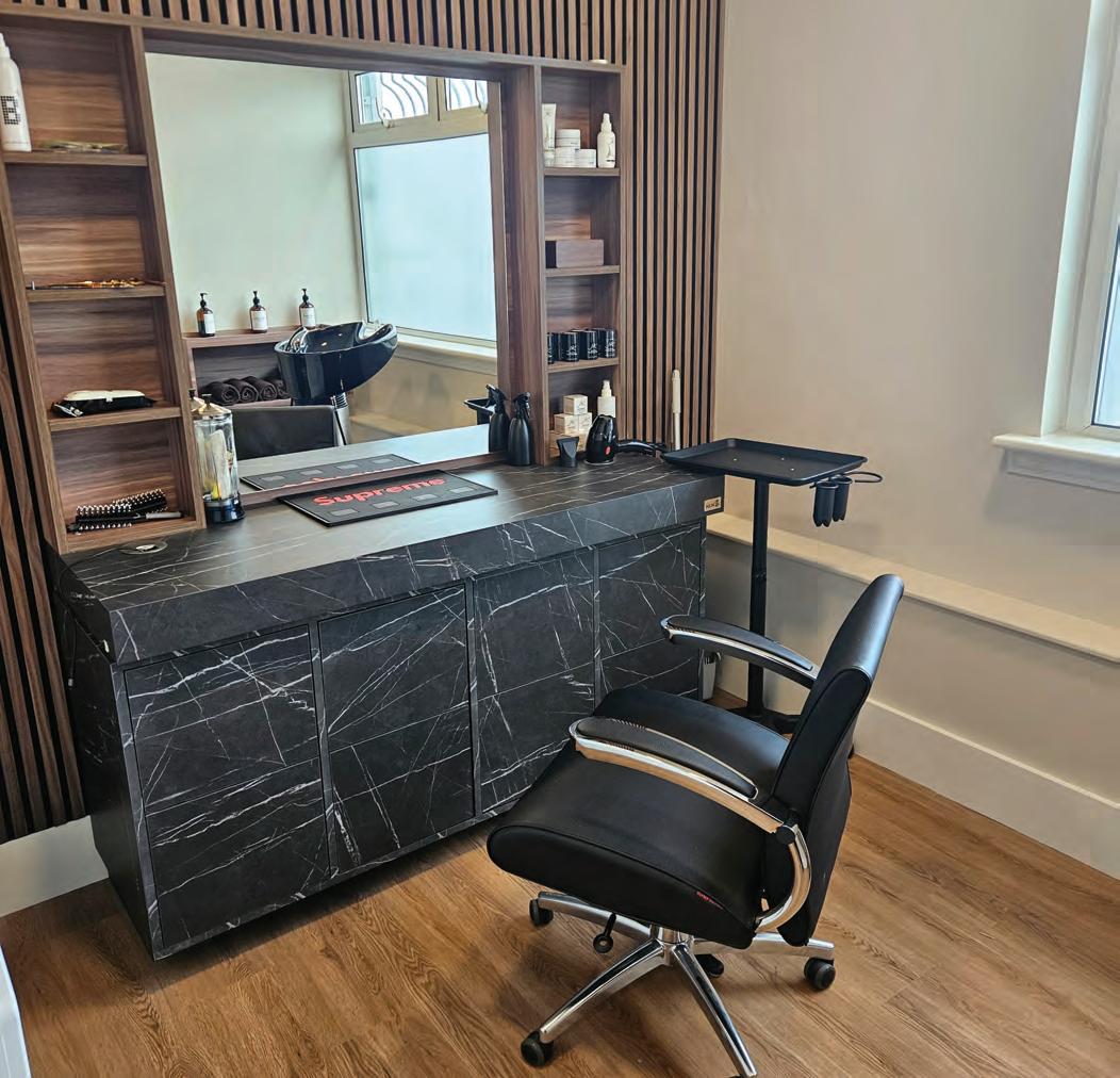 “The workroom needed to have enough storage space, along with space for staff to take a break and relax. We decided on a double-sided kitchen/ workroom, and Michael delivered exactly what we had in mind. For the stylist rooms, we wanted something that would be comfortable and enjoyable for the client to spend time in, but also practical for the stylist. Michael came up with the idea of a free-standing backwash, an all-in-one stylist unit and chairs with wheels. After the client’s hair is washed, the chair can be wheeled over to a lovely desk-like space. They can work, watch a show on their tablet or just relax.”