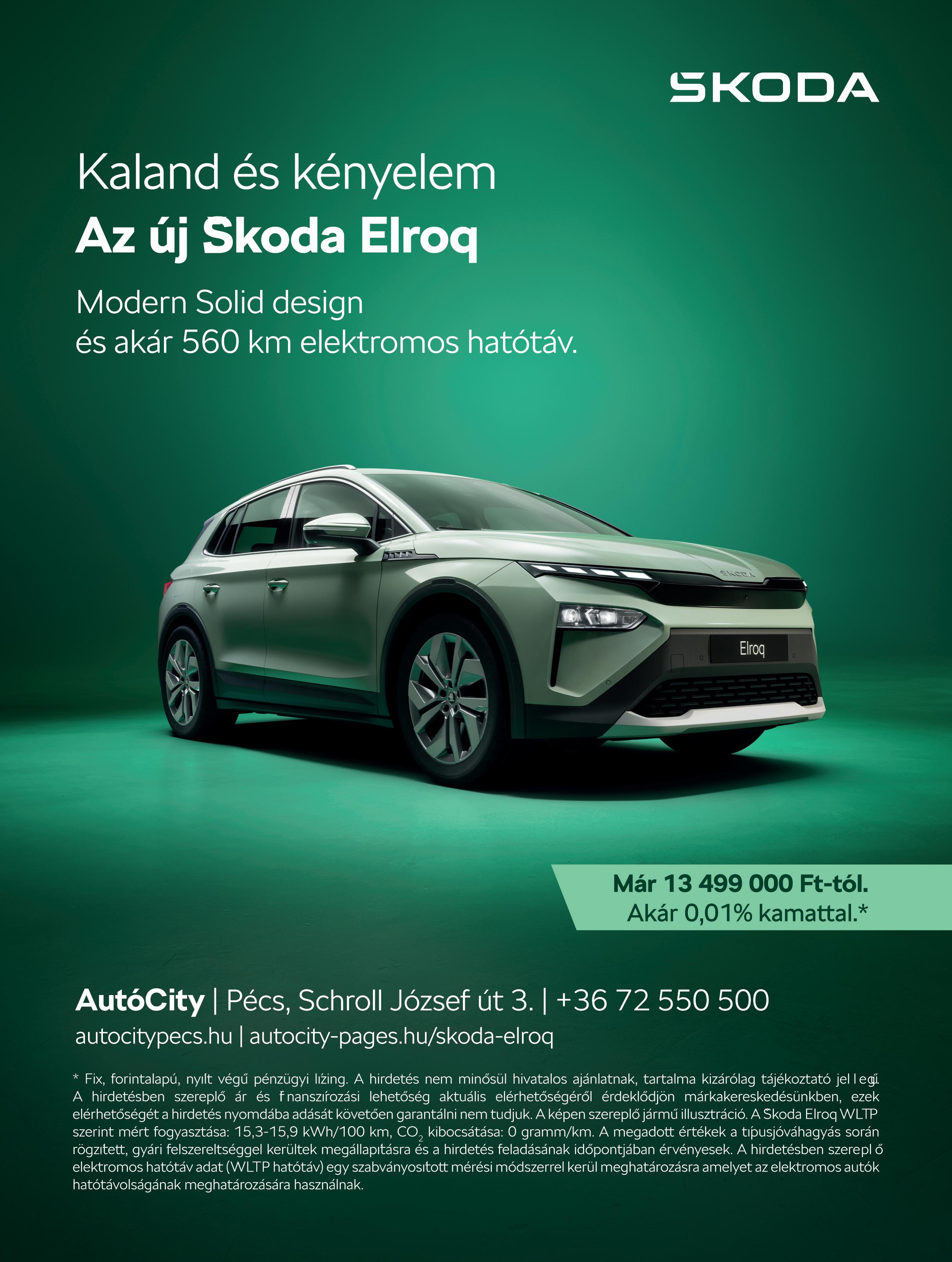 —Én is Skodával járok, igaz nem elektromossal, hanem egy dízel Octaviával. Mivel nagyon sokat autózom, számomra a dízel a megfelelô alternatíva. Bevallom, nem vagyok az elektromos autók elkötelezett híve, ezért is vártam nagyon a próbautat, kíváncsi voltam, hogy mit tud a Skoda harmadik elektromos modellje. Az már jó pont nálam, hogy nem akar mindenáron elektromos autónak látszani az Elroq, helyette a klasszikus SUV formát látom, még az elsô hûtômaszk is olyan, hogy akár belsôégésû motor is lehetne a motorháztetô alatt. A dizájn modern, és az is látszik rajta, hogy remek az összeszerelési minôség. Az Elroq mérete sem túlzó, akár városban is könnyen boldogul. Érdekes módon nekem a hátulja tetszik a legjobban, pedig ott nincs semmi trükk. A szürke fényezésre is mondhatnánk, hogy átlagos, ez a szürke azonban nagyon jól eltalált, vonzza a tekintetet.